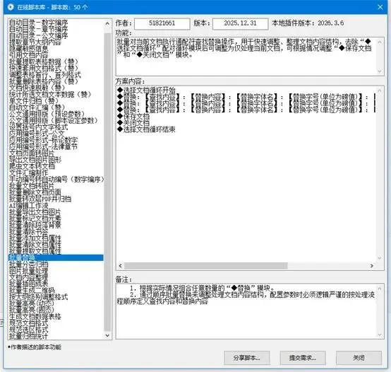这个是批量替换文档里的内容,比如你要把文档里的所有旧的公司名改成新的,或者把所有的旧日期改成新的,点一下这个脚本,它就会自动帮你批量替换,不用你一个个找,一个个改,特别高效。