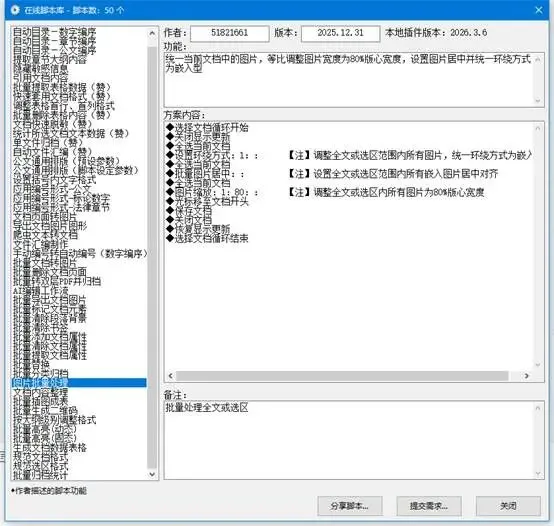 这个是用来批量处理文档里的图片的,比如你文档里的图片大小不一,有的太大,有的太小,点一下这个脚本,它就会自动帮你把所有的图片调整成统一的大小,还能自动对齐,自动排版,不用你一个个调,1分钟搞定。