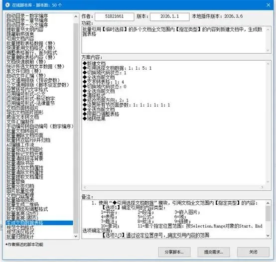 这个是用来提取文档里物业类型内容数据的,提取出来自动生成表格。比如你有一堆文档,要把里面的书签、图片、公式、批注等提取出来,做成表格,点一下这个脚本,它就会按设定自动帮你提取,自动生成表格,不用你一个个复制粘贴,能省很多时间。