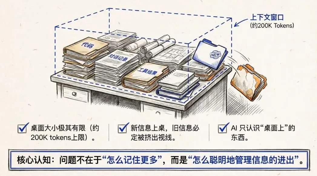 你可以把它想象成AI的“工作桌面”。桌面有大小限制,所有当前对话、代码文件、工具调用结果,都得摆在这张桌子上。桌子满了,新东西进来,旧东西就得被推走。而AI只能看到桌子上的东西,桌子外的,它一概不知。
