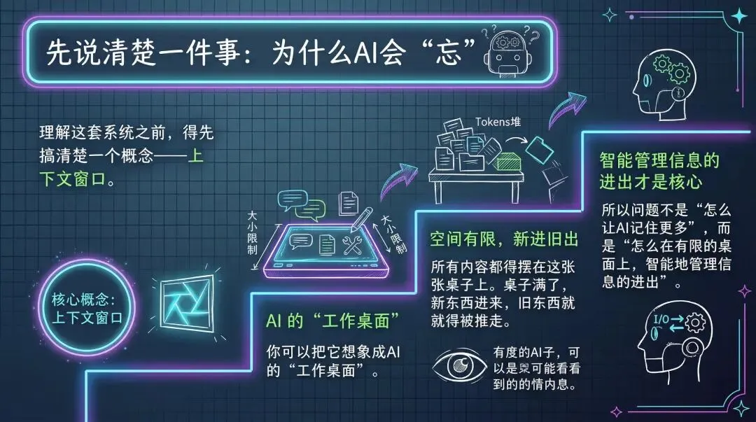 所以问题不是“怎么让AI记住更多”,而是“怎么在有限的桌面上,智能地管理信息的进出”。