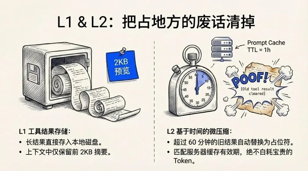 它有一个基于时间的清理逻辑:如果距离上次助手消息超过60分钟,系统会自动把旧的工具结果替换成一行[Old tool result content cleared]。为什么是60分钟?因为Anthropic的服务器端Prompt Cache的TTL(缓存有效期)大约就是1小时——缓存已经失效了,继续保留这些内容只是在白白占用宝贵的token。