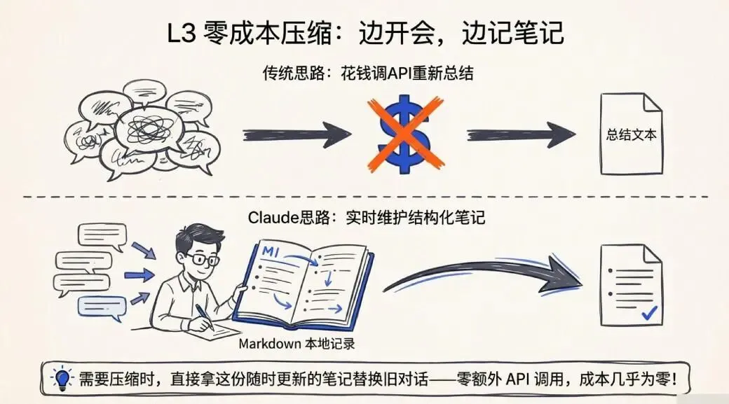 等到真正需要压缩的时候,系统直接拿这份随时更新的笔记当摘要,把旧对话替换掉——零额外API调用,成本几乎为零。