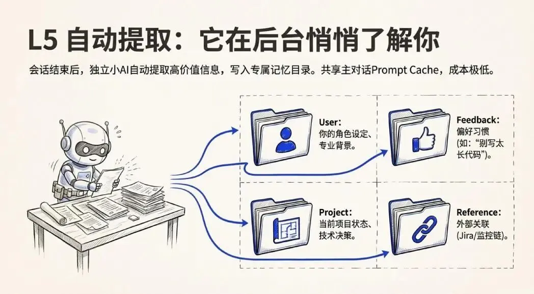 前面四层解决的都是“会话内”的问题——一次对话里怎么管好桌面。但真正的长期记忆,靠的是第五层:自动记忆提取。