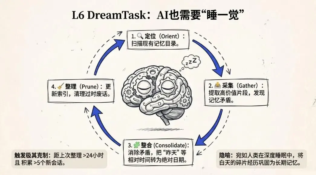 它的触发条件设计得极其克制:距上次整理超过24小时,且积累了超过5个新会话,才会启动。不会频繁打扰你,但也不会让记忆一直处于碎片化的状态。
