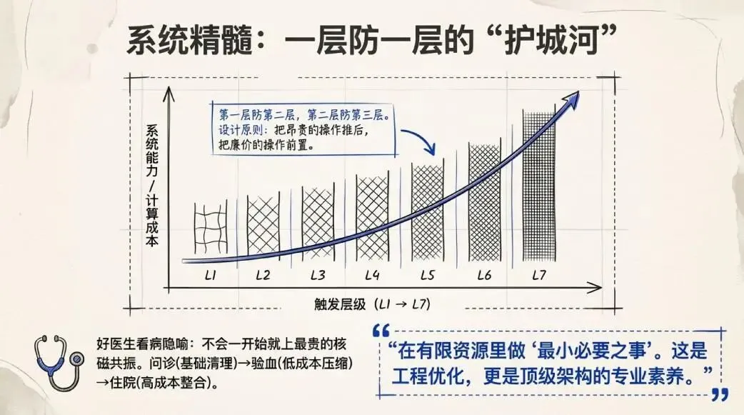 第一层防第二层,第二层防第三层,以此类推。越往上,触发成本越高,能力也越强。整套系统像一道道防线,把昂贵的操作尽可能推后,把廉价的操作尽可能前置。