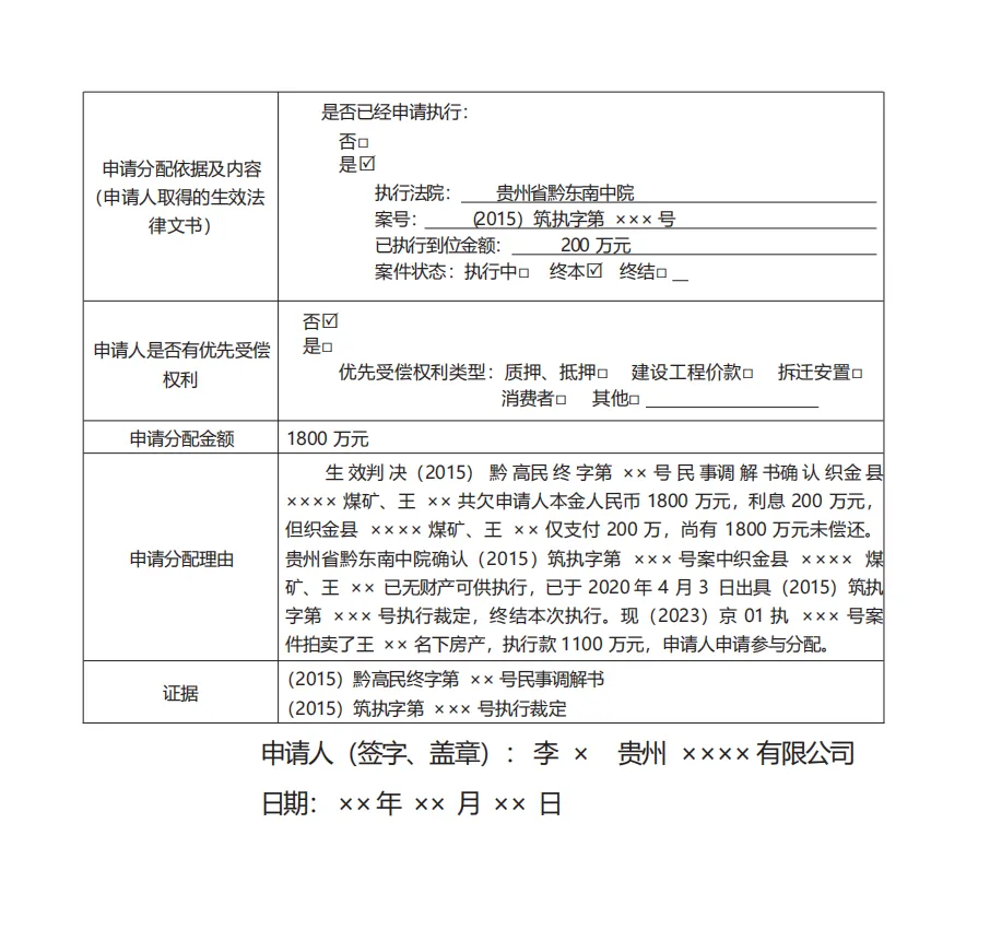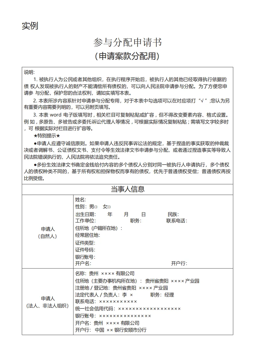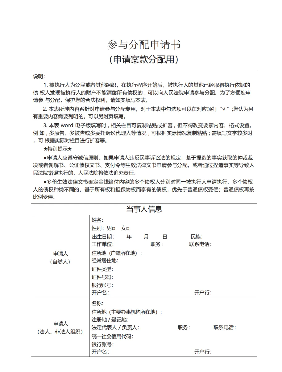 参与分配申请书(下附新版要素式电子版,可下载)