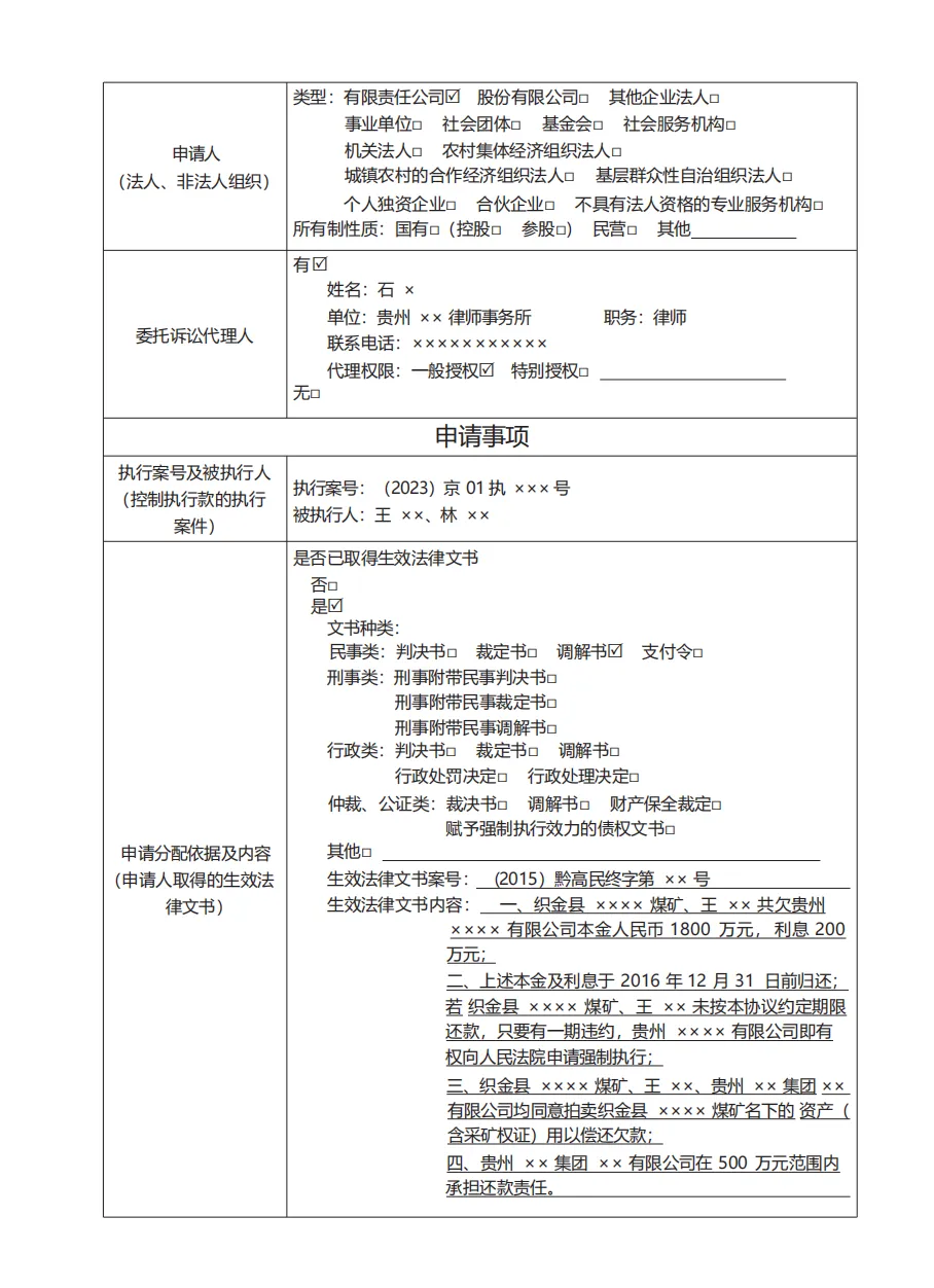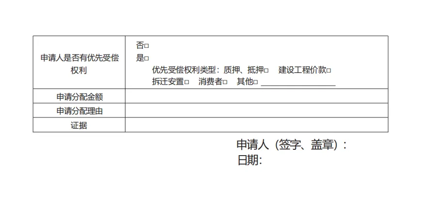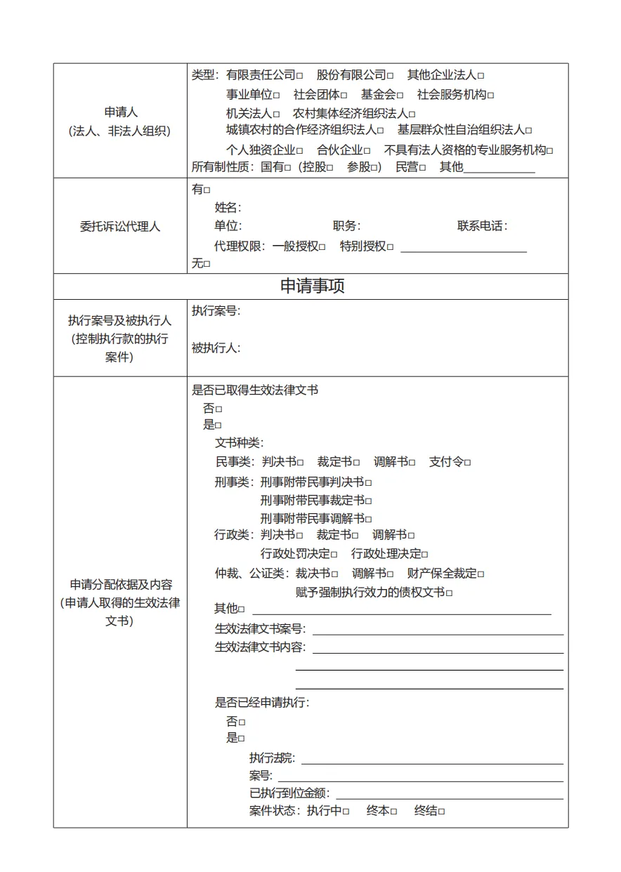 (二)申请事项部分。该部分在填写时应根据要素式申请书提示,对参与分配执行案件的案号、被执行人、申请分配的依据及内容、是否具有优先受偿权、申请分配金额等按实际申请内容进行勾选。