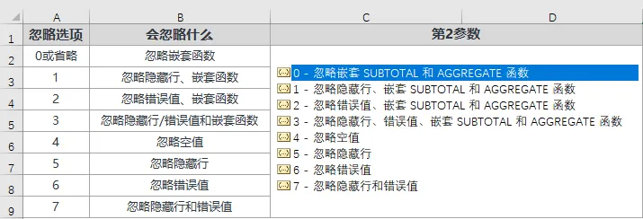 =AGGREGATE(功能代码, 忽略选项, 引用区域, [k可选参数])