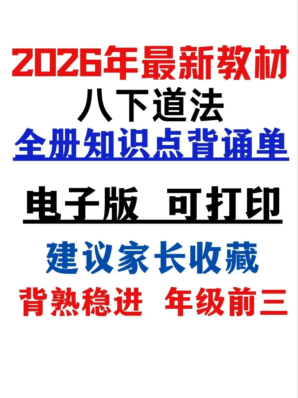 很多同学道法丢分,不是不会背,是抓不住重点、记不全考点。这份按最新教材整理的全册知识点背诵单,把每一课核心内容、必背考点、关键语句都梳理得明明白白,不用自己再划重点、抄笔记,拿来就能背。