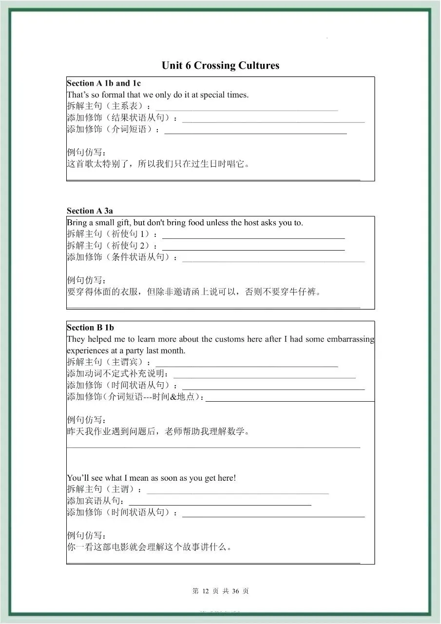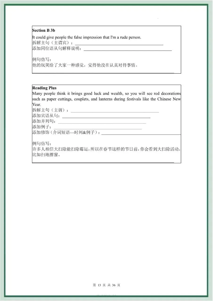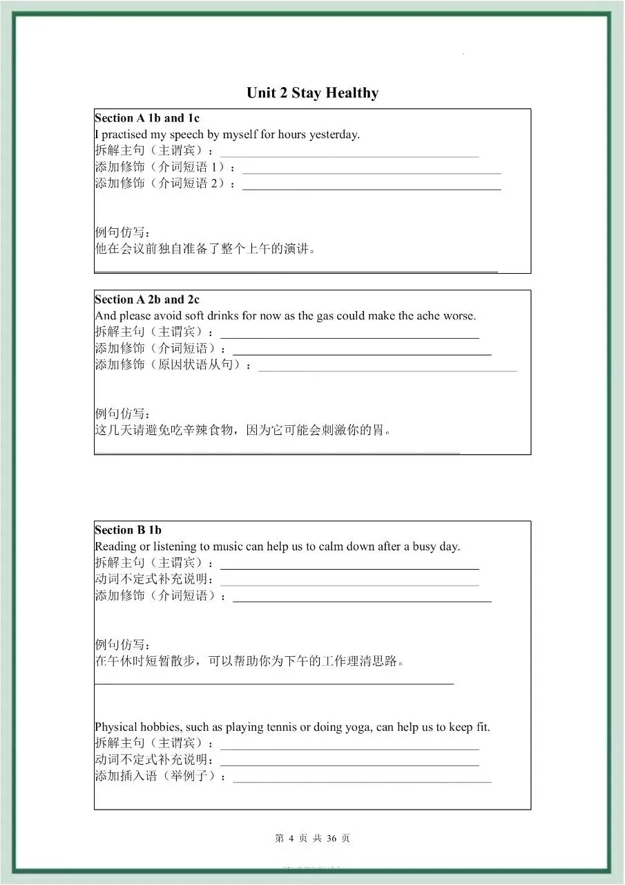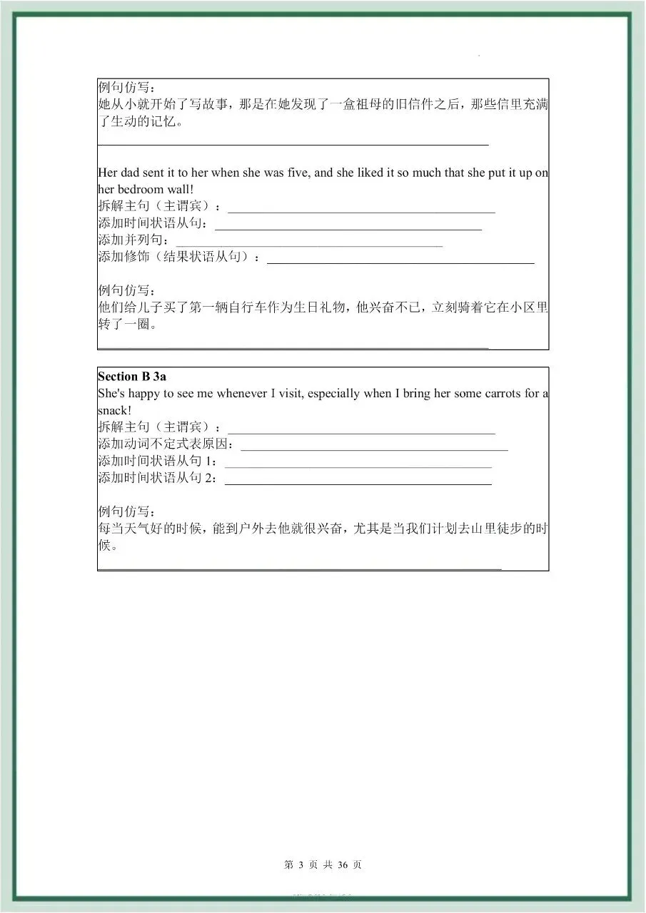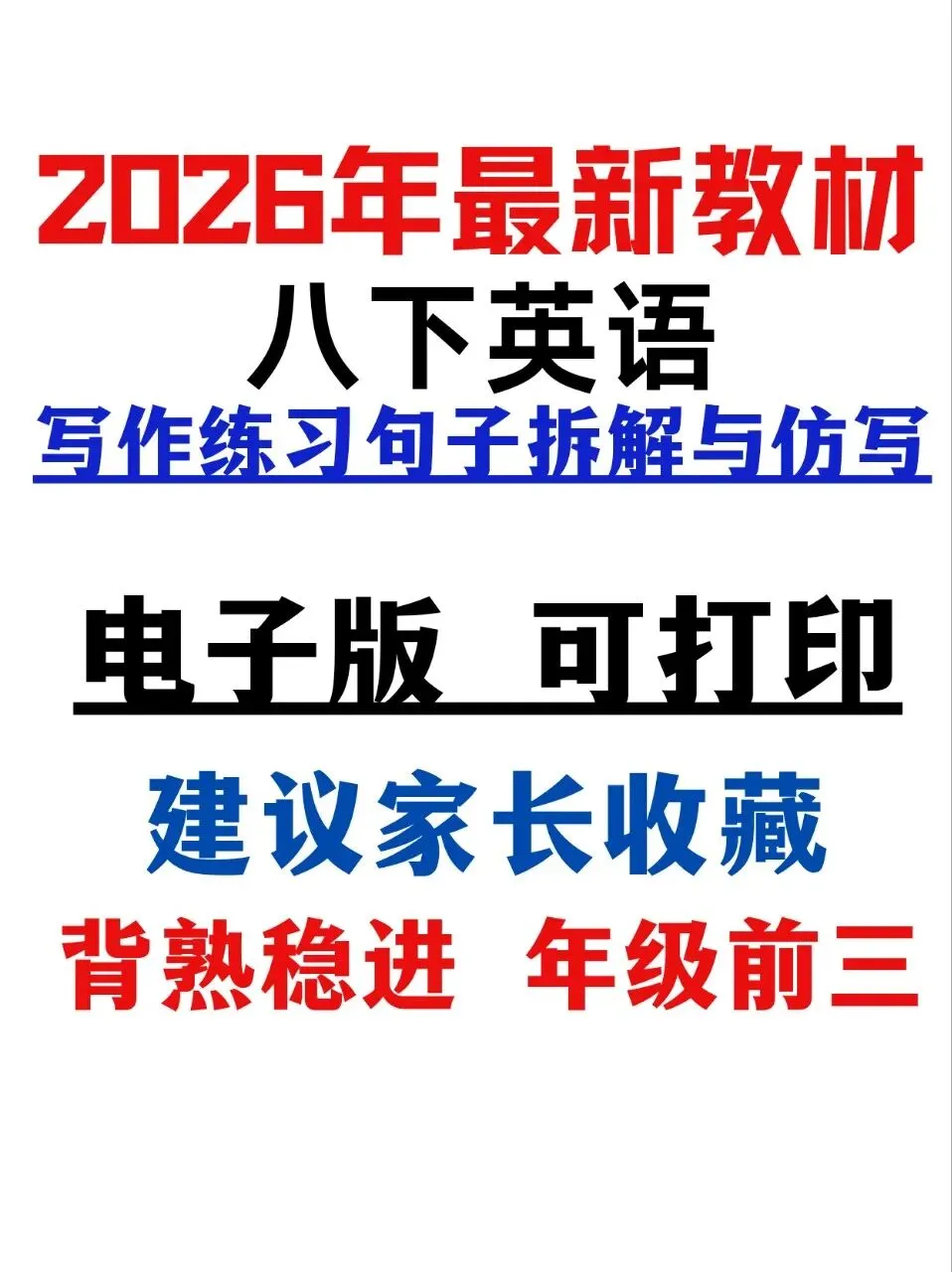 很多同学英语写作丢分,不是单词不会,而是句式不会用、文章不会搭。这份按最新教材整理的句子拆解与仿写,把八下核心句型拆得清清楚楚,结构一看就懂,换词就能仿写,不用死记硬背整篇范文。