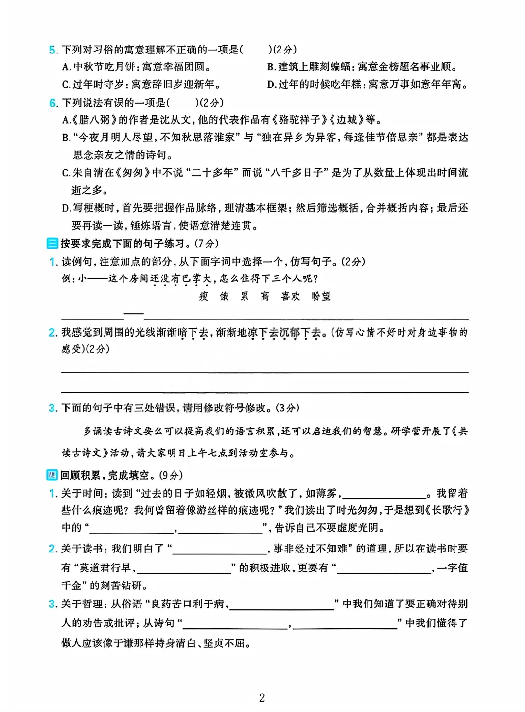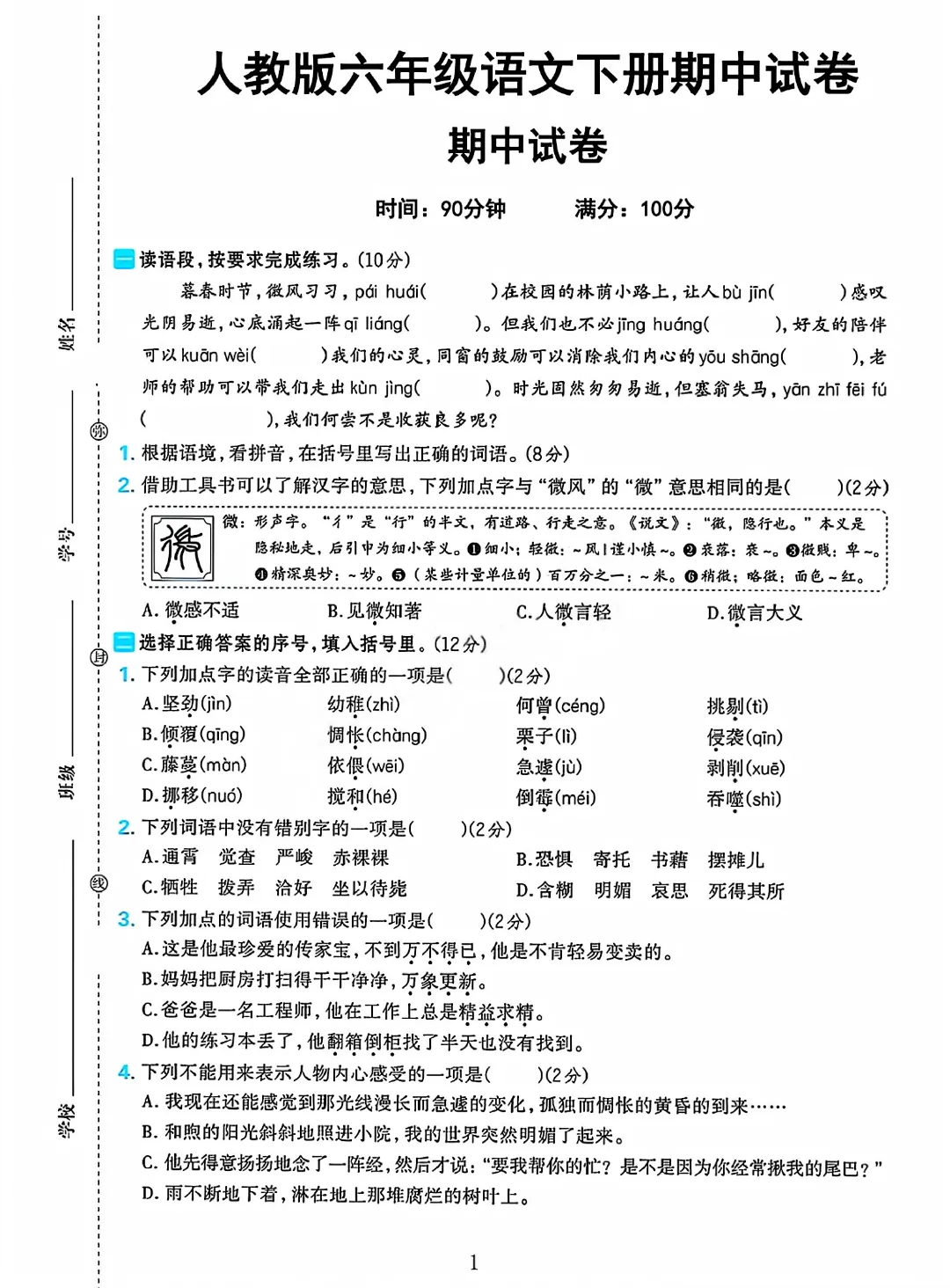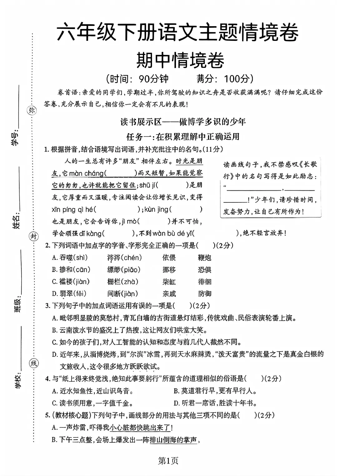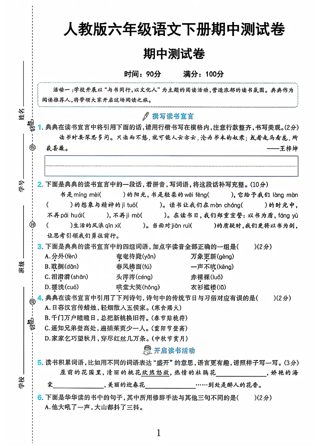 2026春六下语文人教版期中测试卷电子版可打印