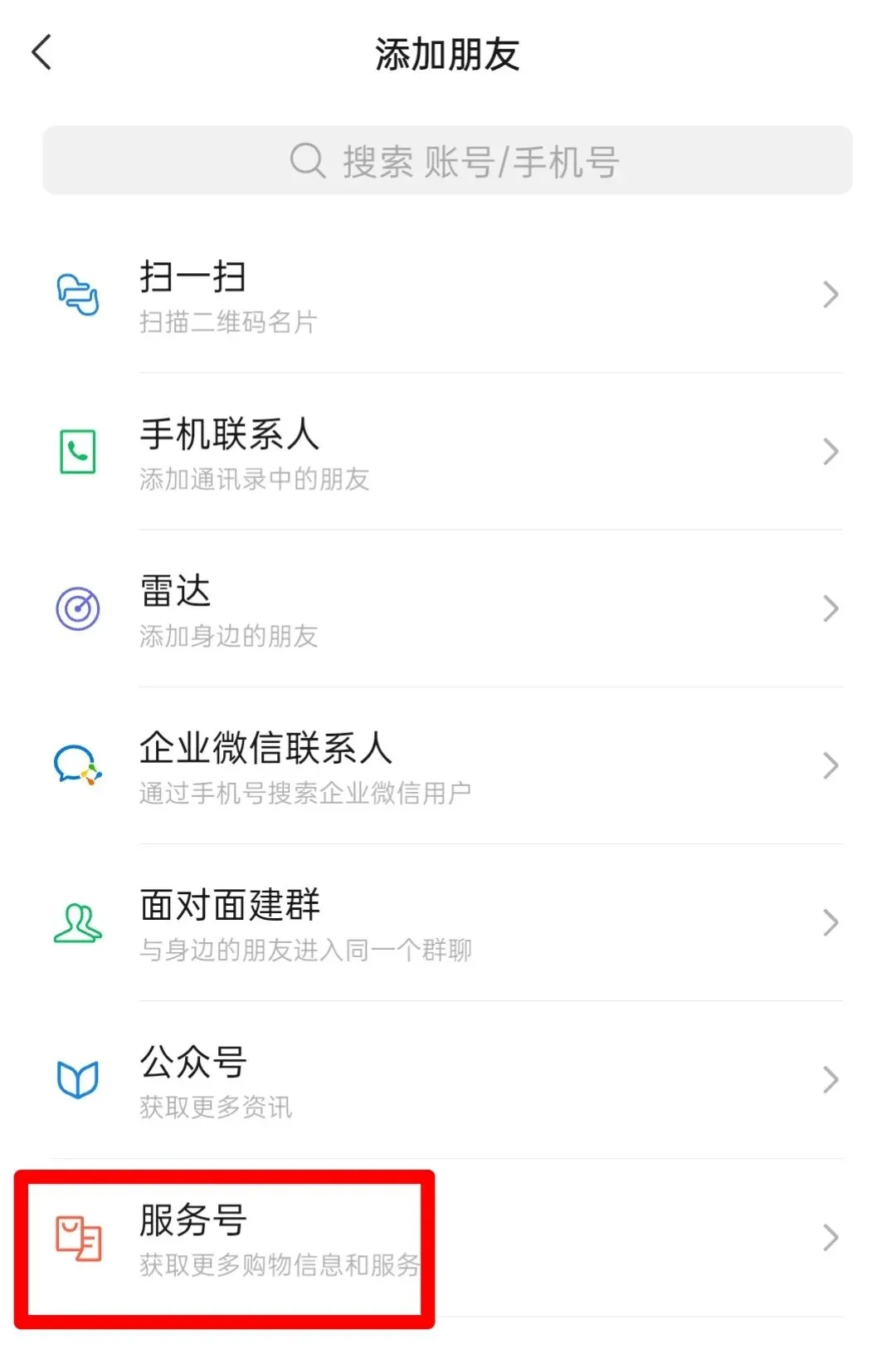 在微信右上角添加朋友里,多出服务号选项,方便快速查找购物、生活类服务号,目前图标暂为旧版样式。