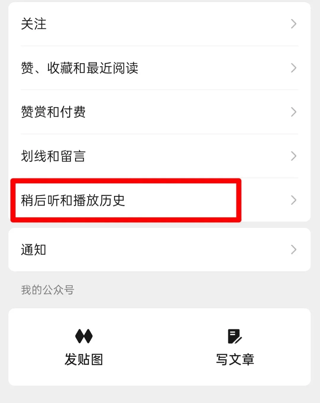 进入公众号个人中心,能看到稍后听、播放历史,没听完的文章可以存着下次继续听,自动记录听过的内容。