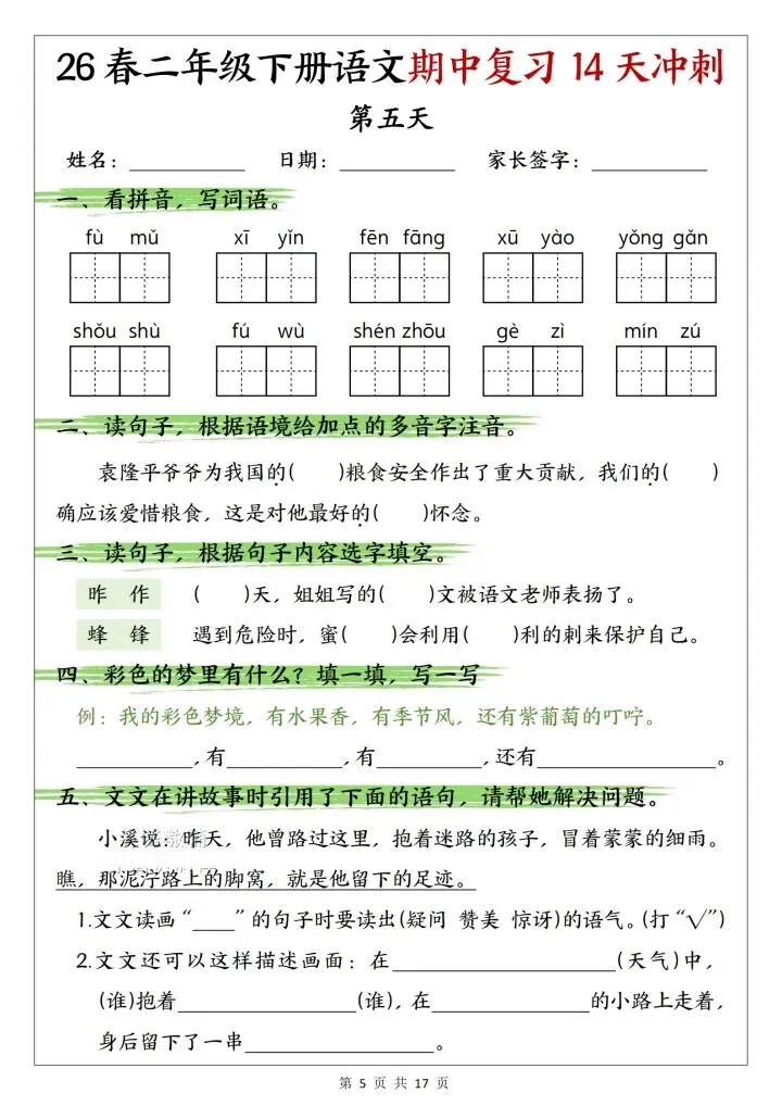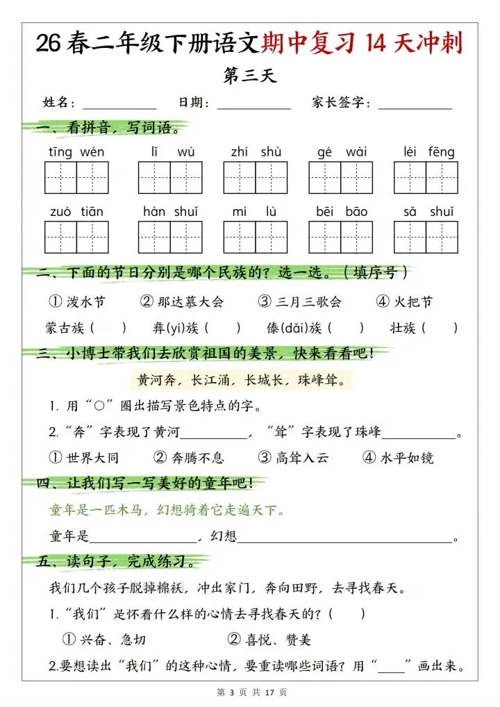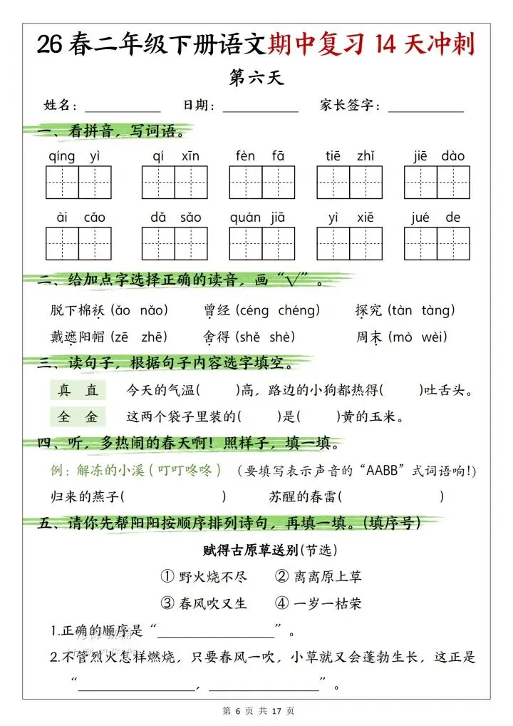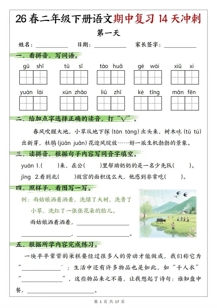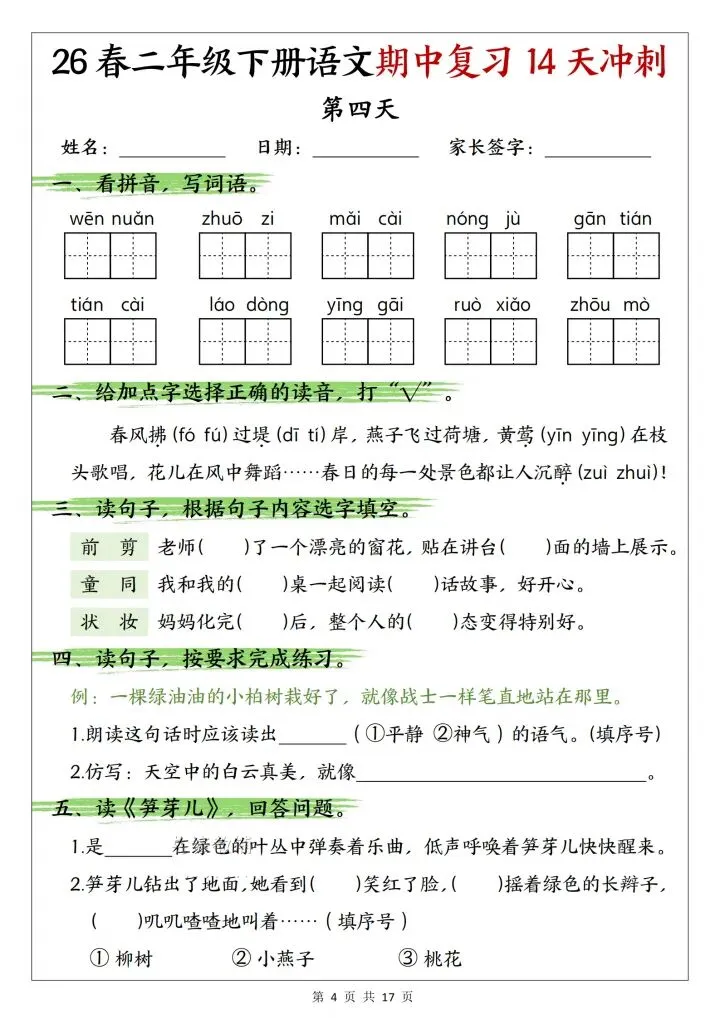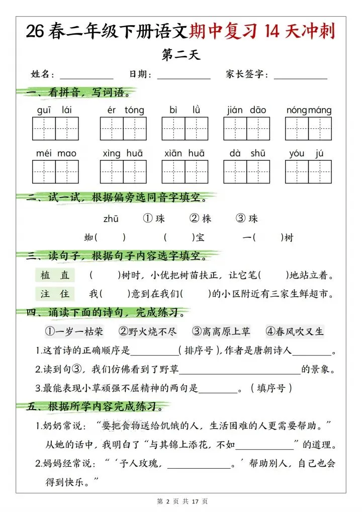 二年级下册语文期中复习14天冲刺 电子版 可打印