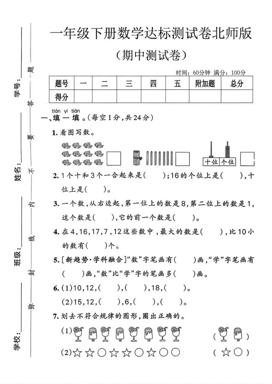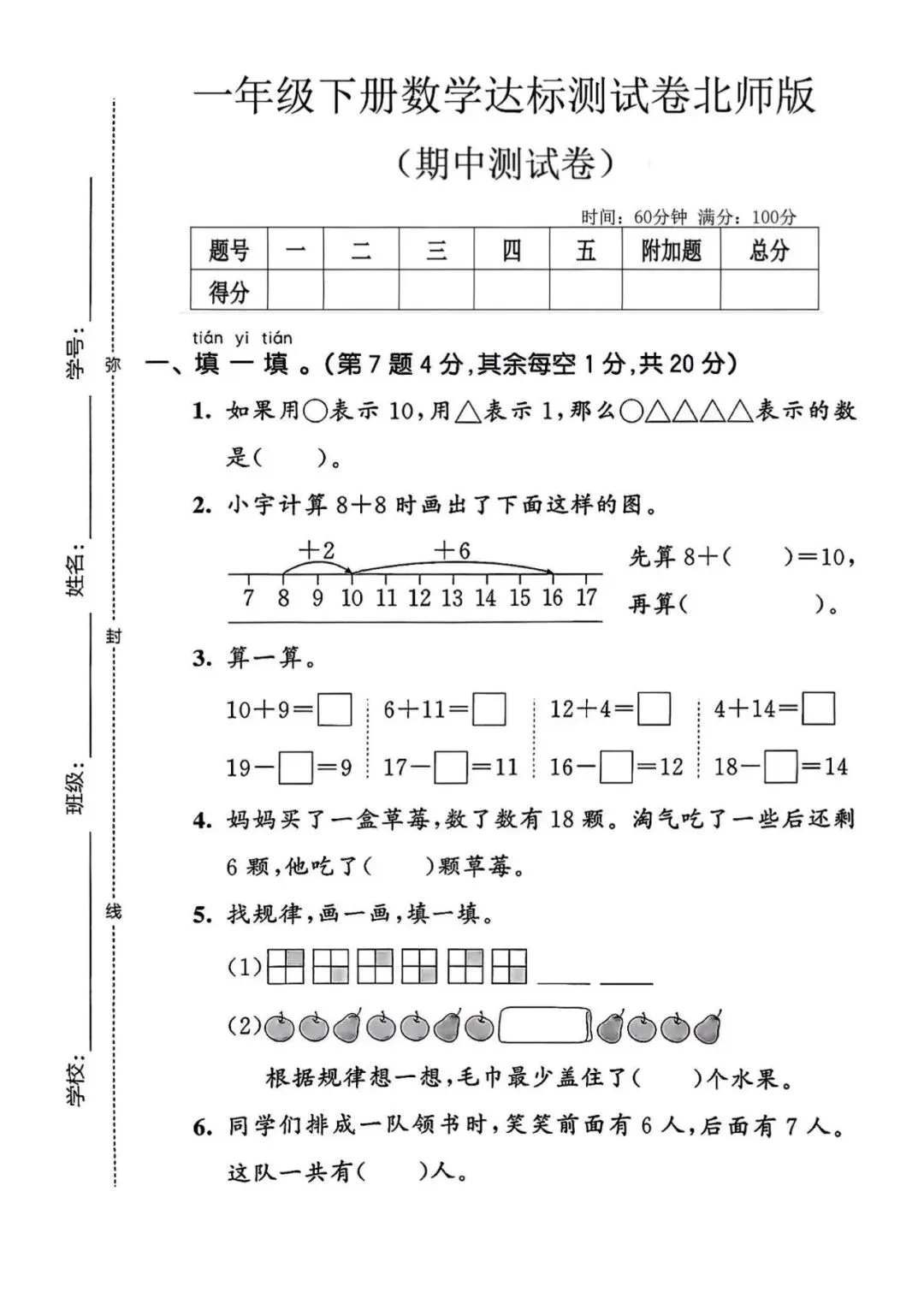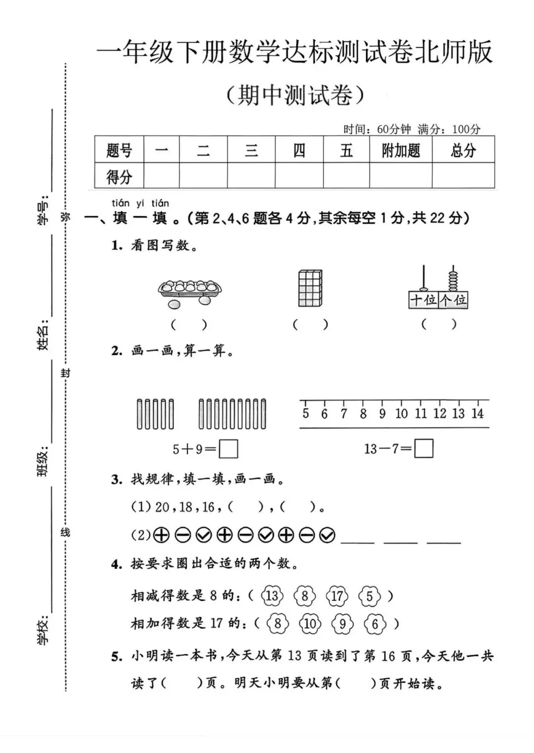 大家好,我是蒂尼江,今天分享的是北师版一年级下册数学期中测试卷4套;附答案,关注我,每天持续分享更多的优质学习资料。