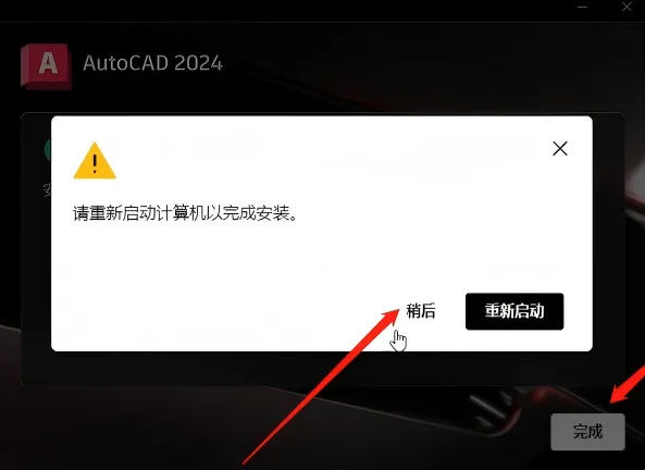 第六步:安装完成后,出现重启计算机选项,点击稍后,然后点击完成。