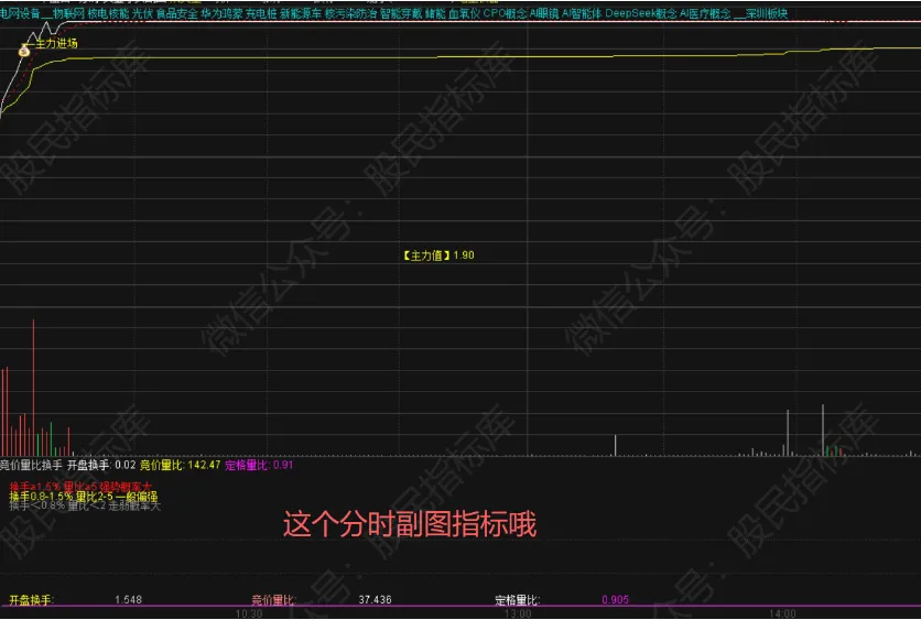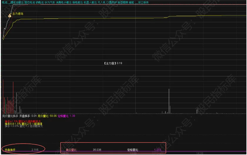 我是将【竞价量比+开盘换手】制作在一个分时副图公式里的,这样看起来比较方便。