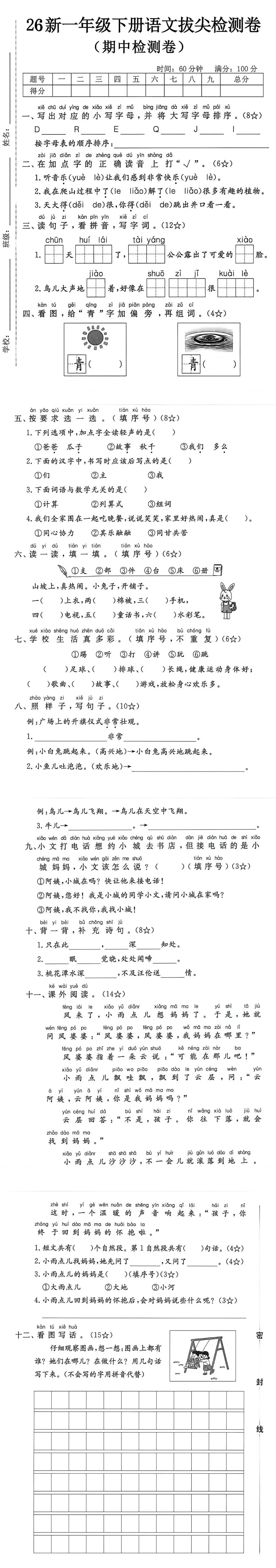 26年一年级下册语文《语文期中检测卷》,电子版可打印