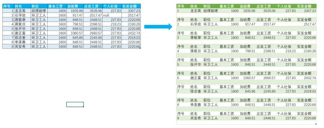 今天这部分内容,对人事比较友好。因为人事每月要发工资条。因为这是极其机密的事情,所以要谨防泄露。那么当让员工签字的时候,左边的表格就太容易泄密,而且打印出来也不方便。右边这种格式,无论是从保密还是打印的角度,都方便很多。