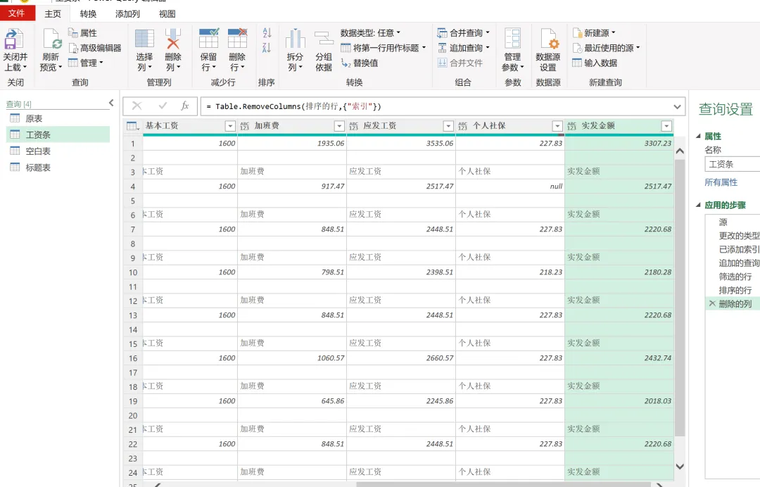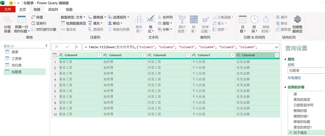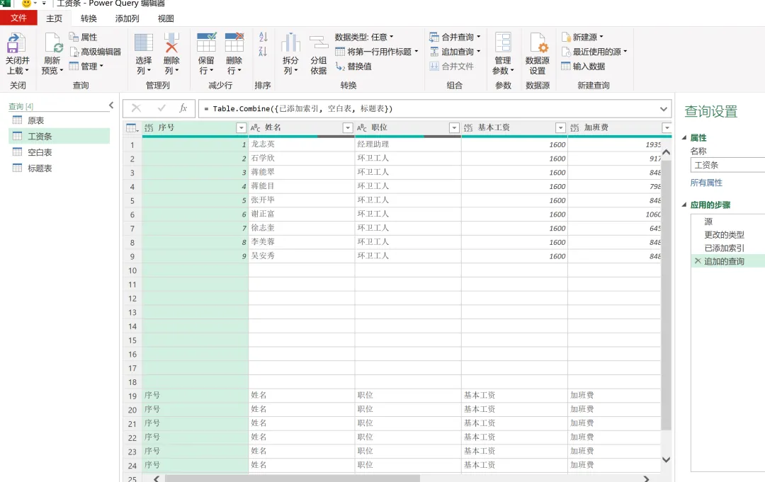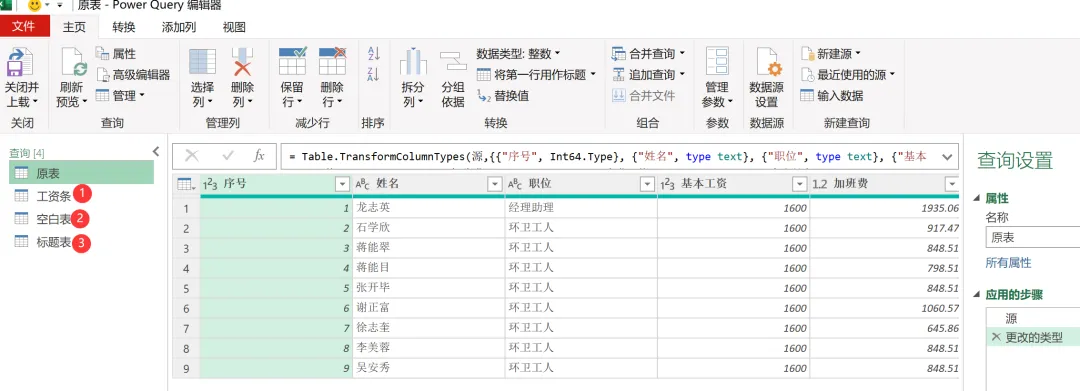 1)将左表放入查询编辑器。为防止操作过程中左表原始数据丢失,咱们来复制3个表格,分别命名为工资条,空白表,标题表,见以下所示。