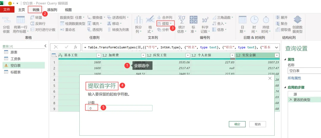 2)选择空白表,然后使用功能区转换-提取-提取首字符,然后在计数里输入0. 这一步的目的,是清空原表格内容,将这个表格设置为空白表格。这里注意下,是需要全选,选择所有列。