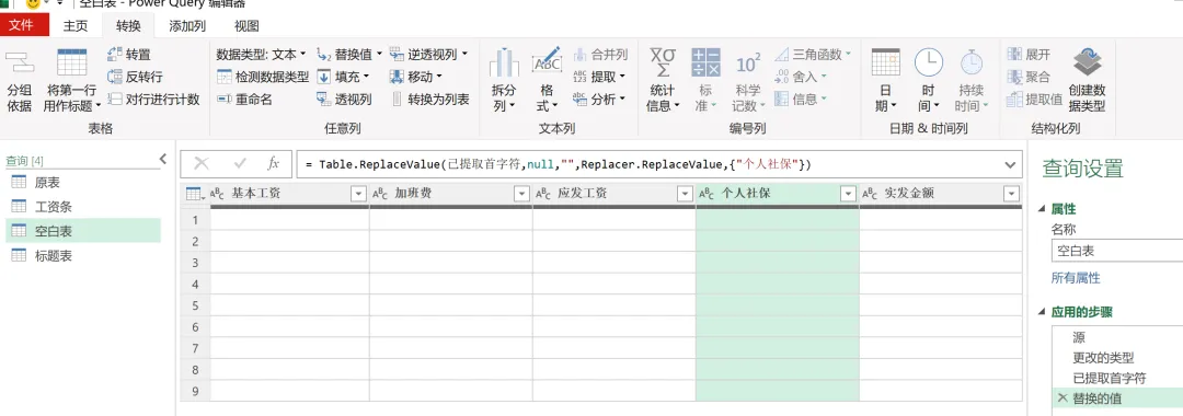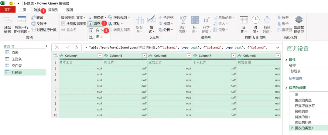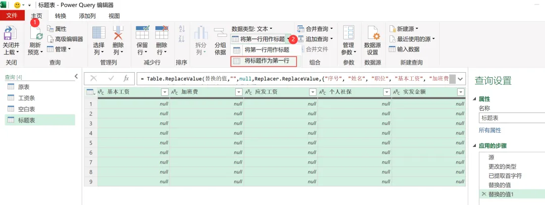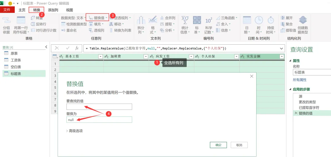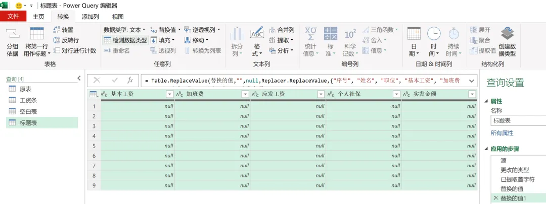 4)选择标题表,然后重复上面的操作,先把标题表,也转化为空白表格。然后选择所有的空白列,选择转换-替换值,把所有空白单元格替换成null。注意下,这里是null不是NULL. Power Query对大小写是很敏感的。如果填充成NULL,后面的向下填充就操作不了。