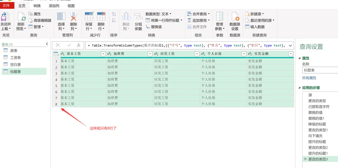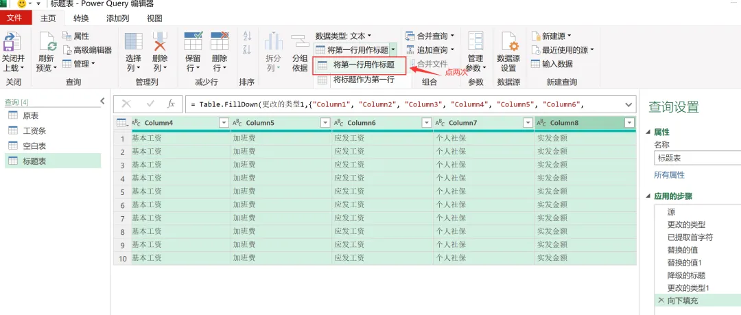 8)因为3个表都有标题行,所以相当于是这个表格里的标题行要删掉2行,才能保证工资表的准确性。那就相当于执行2次将第一行作为标题行。操作如下图所示。
