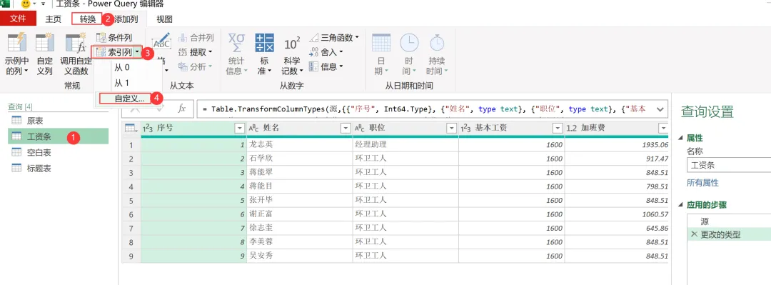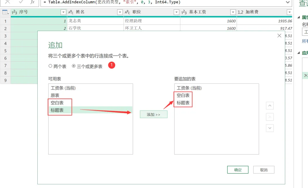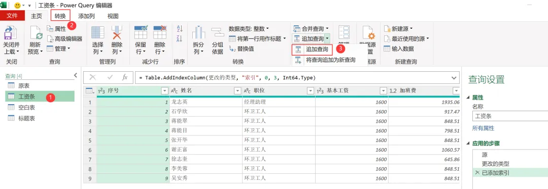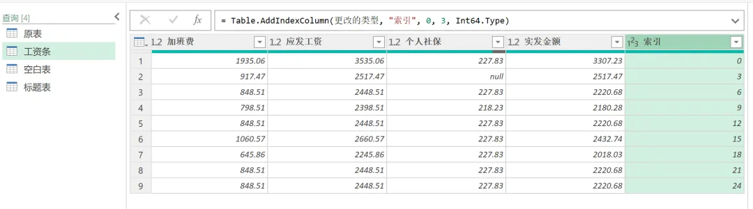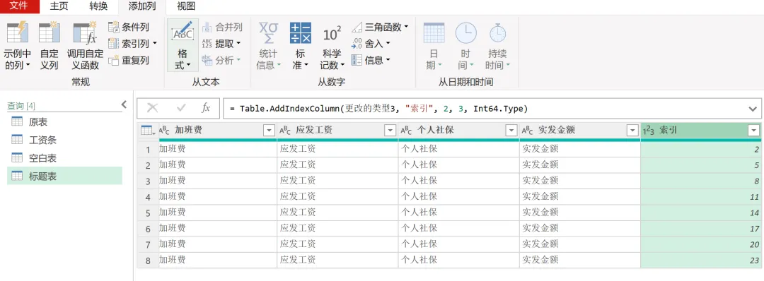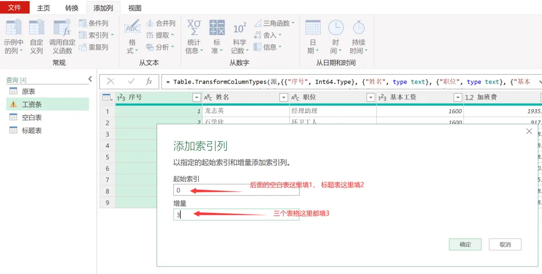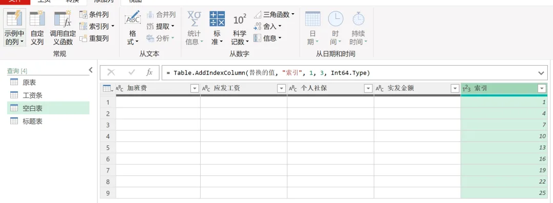 10)分别选择工资条,空白表,标题表,为3个表格添加索引列。注意,选择顺序不同,索引列的起始值不同。我们就按照工资条,空白表,标题表的顺序来添加索引列。以工资条为例。操作如下图所示。