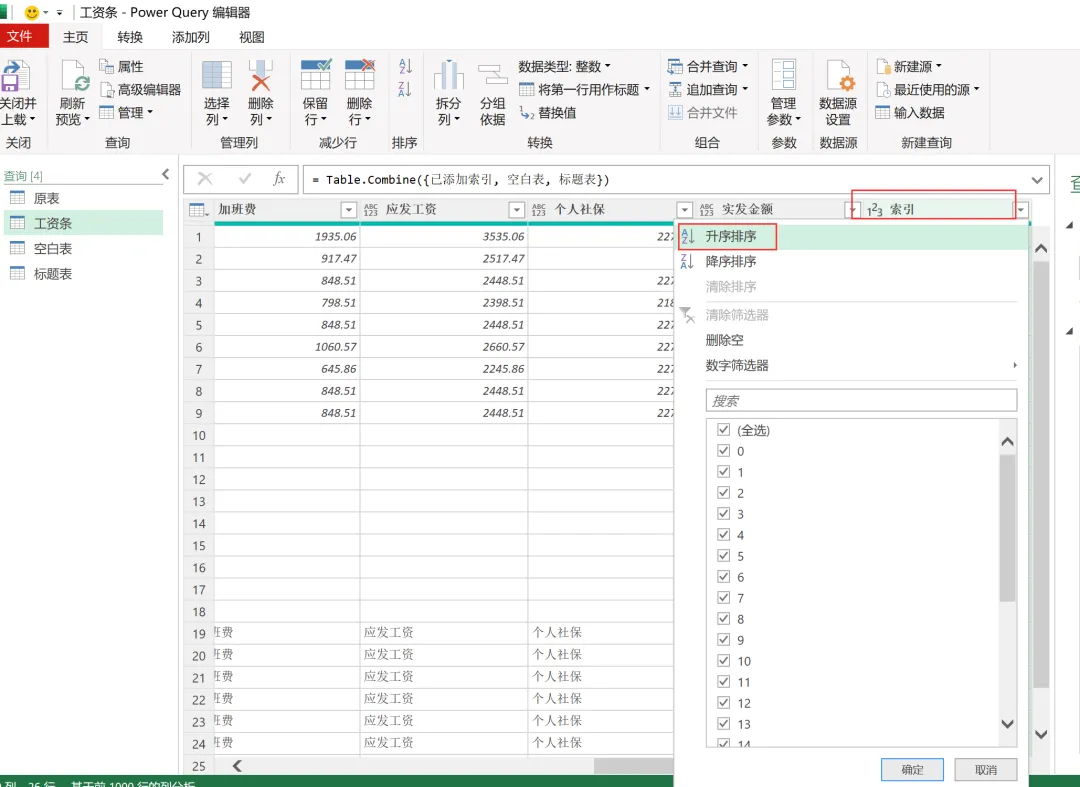 3. 当多个表格合并后需要有个行显示的先后顺序的时候,就需要用到索引列。按照想要显示的顺序来设置表格的索引列的顺序。等表格合并好后就可以删掉了。