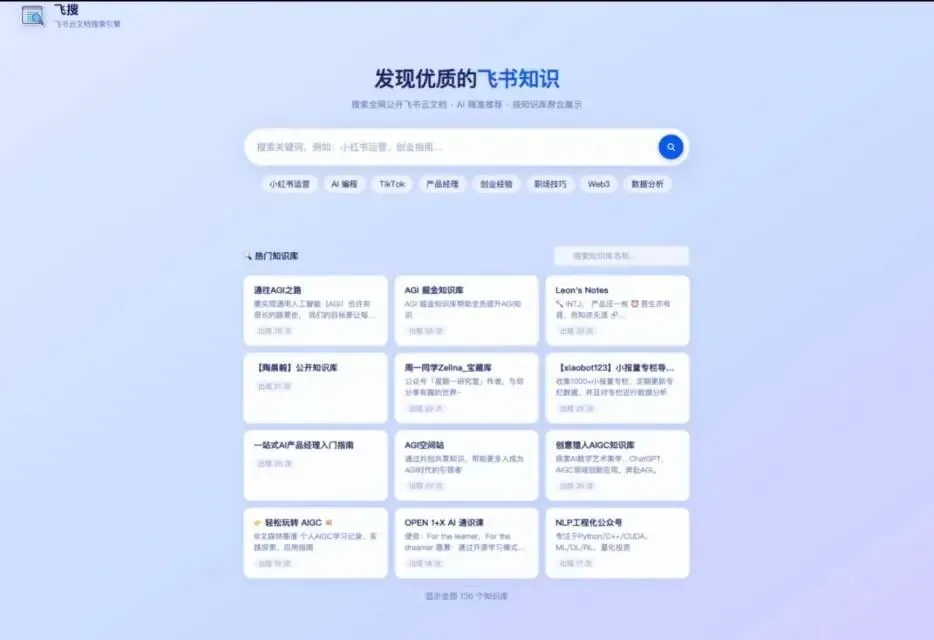 • 原理:爬取全网公开可访问的飞书云文档 → 建立索引 → 支持关键词搜索 → 按知识库维度展示