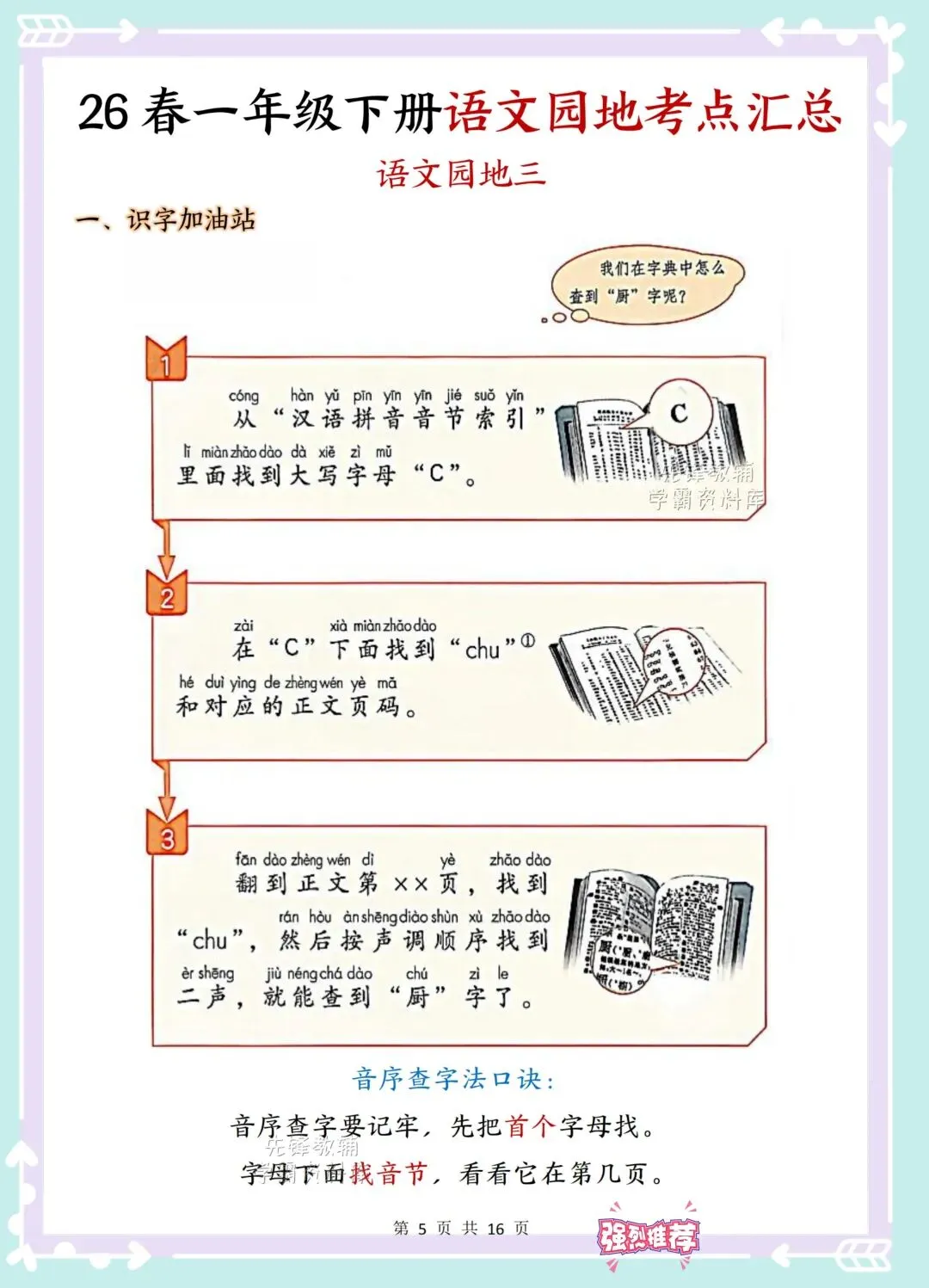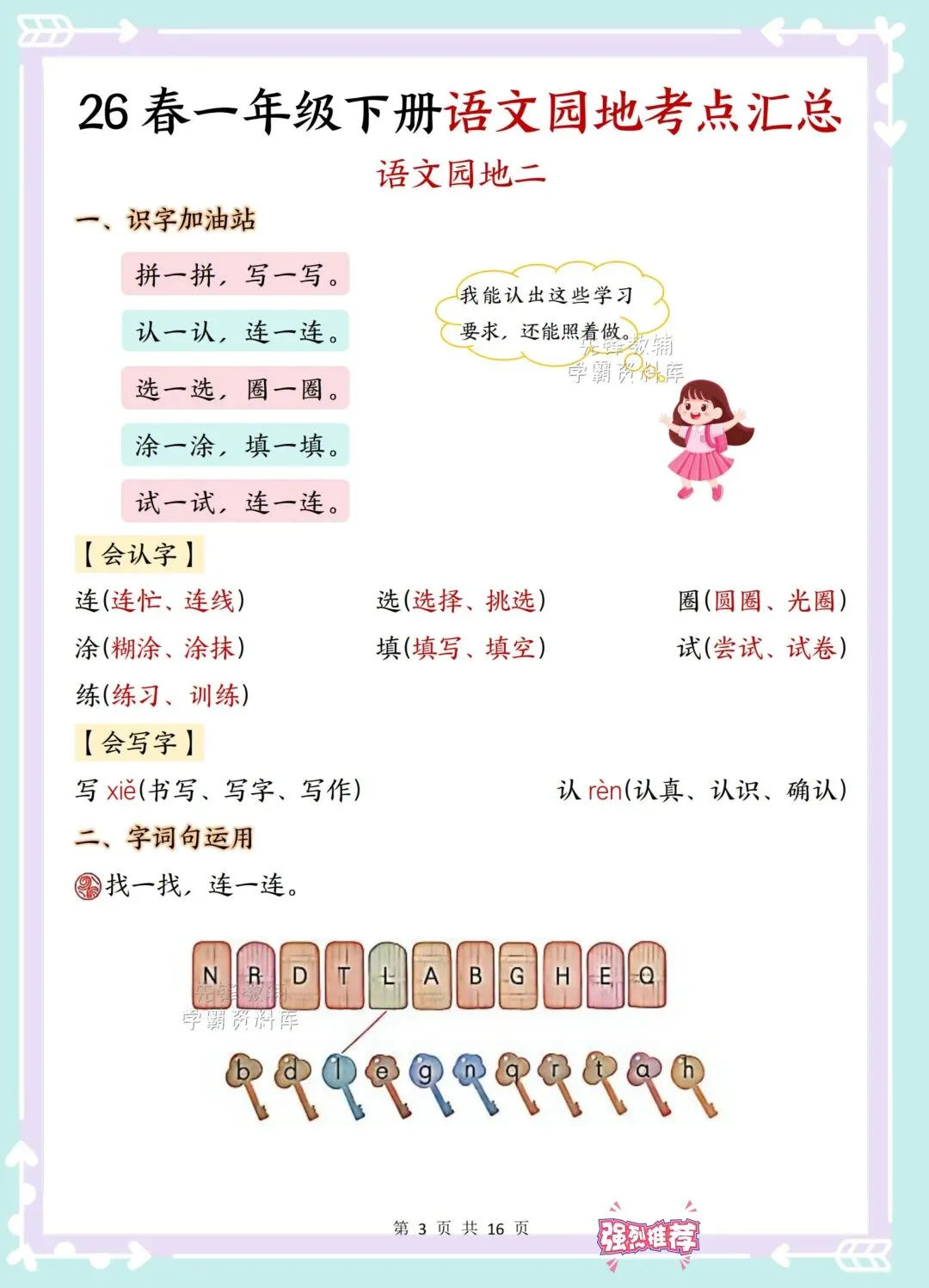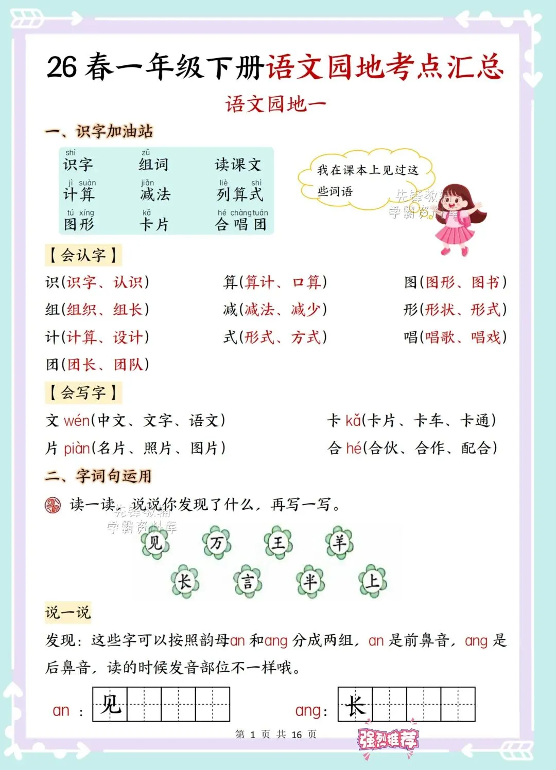 别急!今天给大家分享一份2026春季最新版的 《一年级下册语文园地考点汇总》,帮孩子把全册重难点“一网打尽”!✨