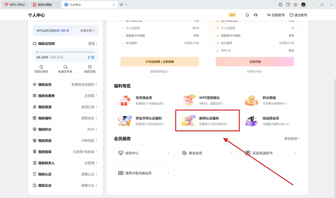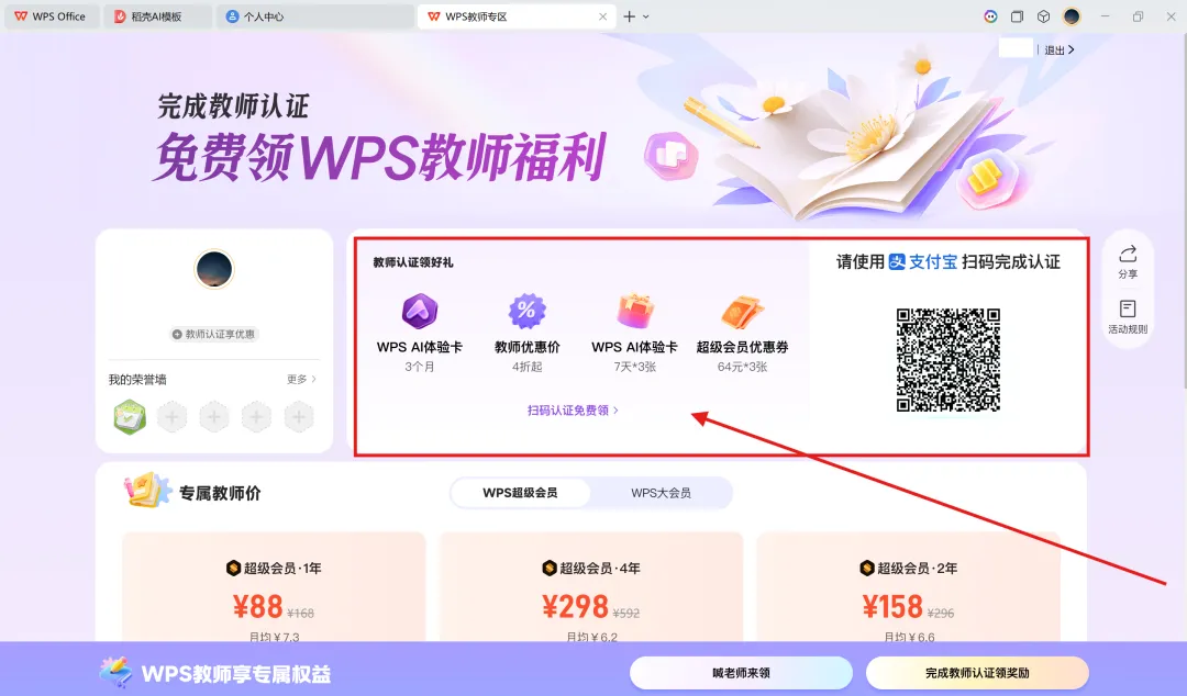 福利推荐–教师专享福利WPS教师专区支付宝教师认证领好礼 1、WPS 2、点击头像–进入“个人中心” 3、“福利专区”–“教师认证福利”–进入“WPS教师专区” 4、“WPS教师专区”–“教师认证领好礼”-支付宝扫码认证 WPS AI体验卡3个月 WPS AI体验卡7天X3张 超级会员优惠券64元X3张 教师优惠价办理会员权益
