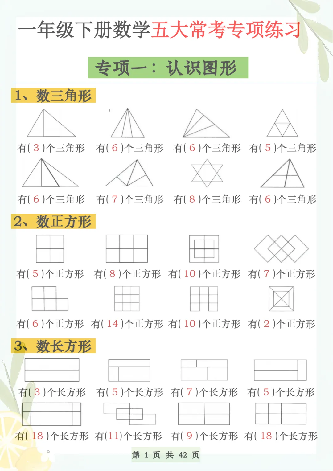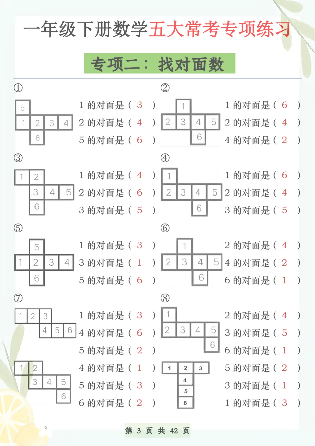 一年级下册数学《五大常考专项练习》共42页,电子版可下载可打印,内容围绕一年级下册数学学习中的常见考点与重点题型设置,涵盖多个核心知识点与专项训练内容,适合孩子在学完课内内容后进行集中巩固与查漏补缺,帮助孩子进一步熟悉解题思路、提升计算与应用能力。需要的家长可以尽快下载打印出来,让孩子有针对性地练一练。