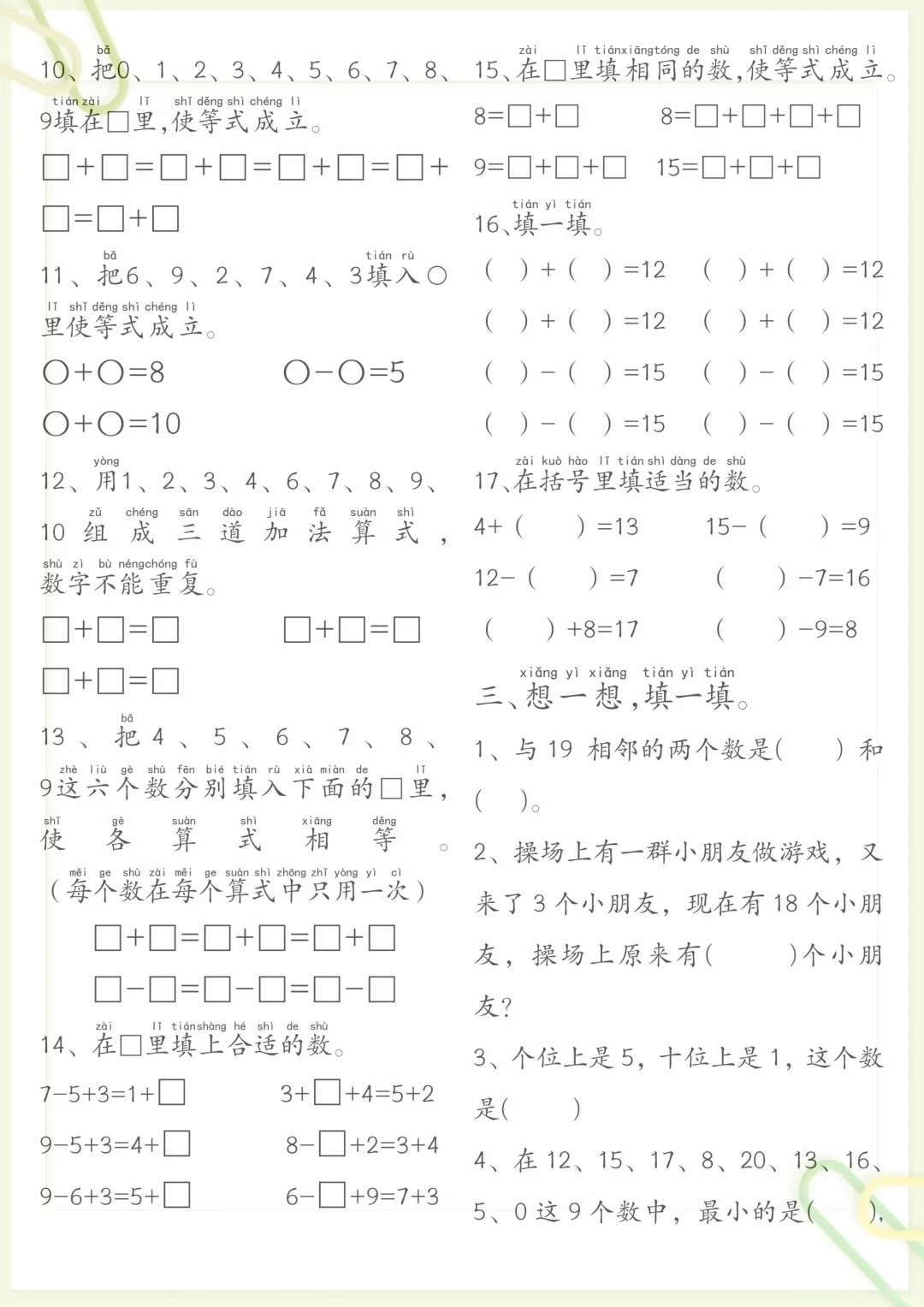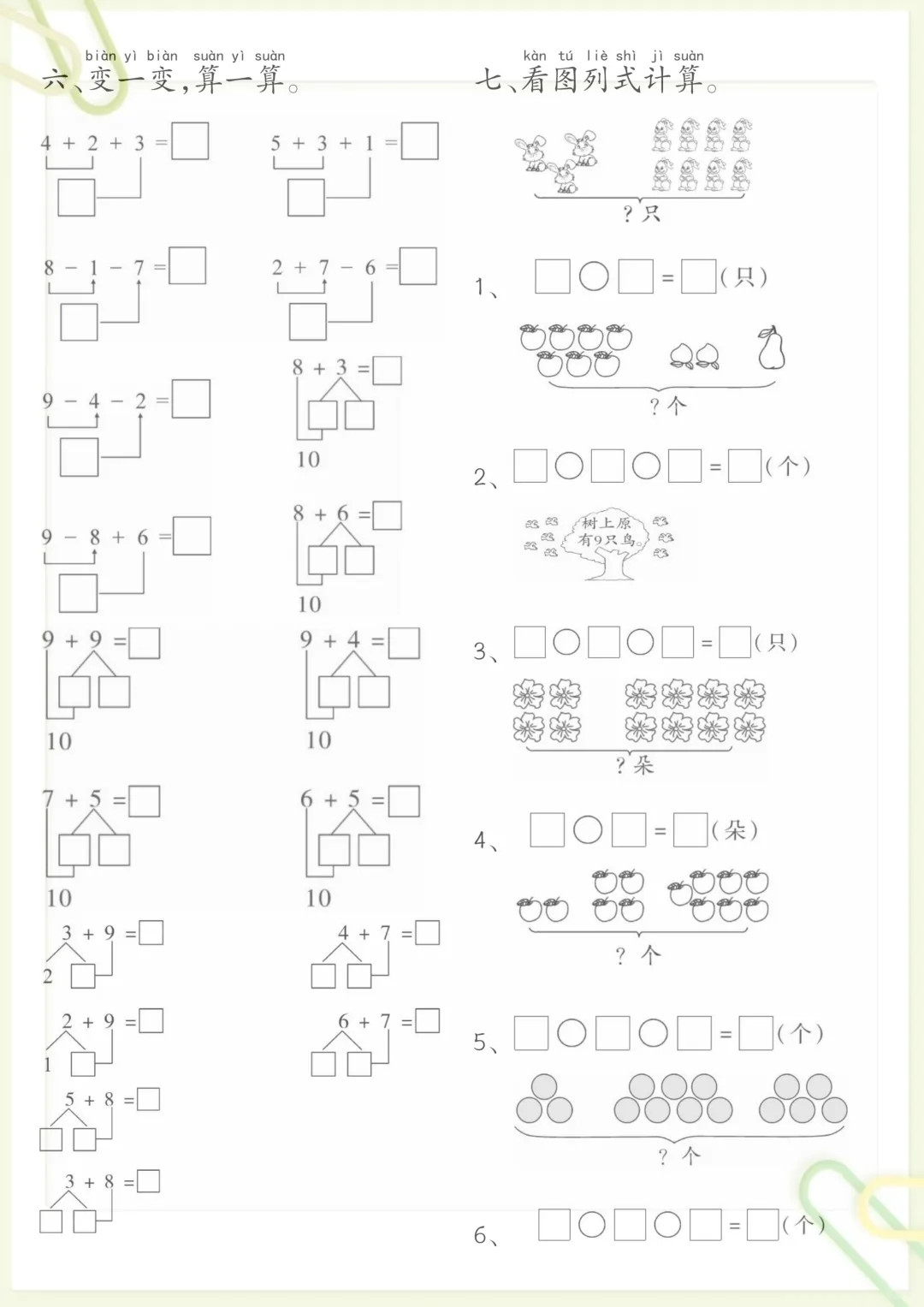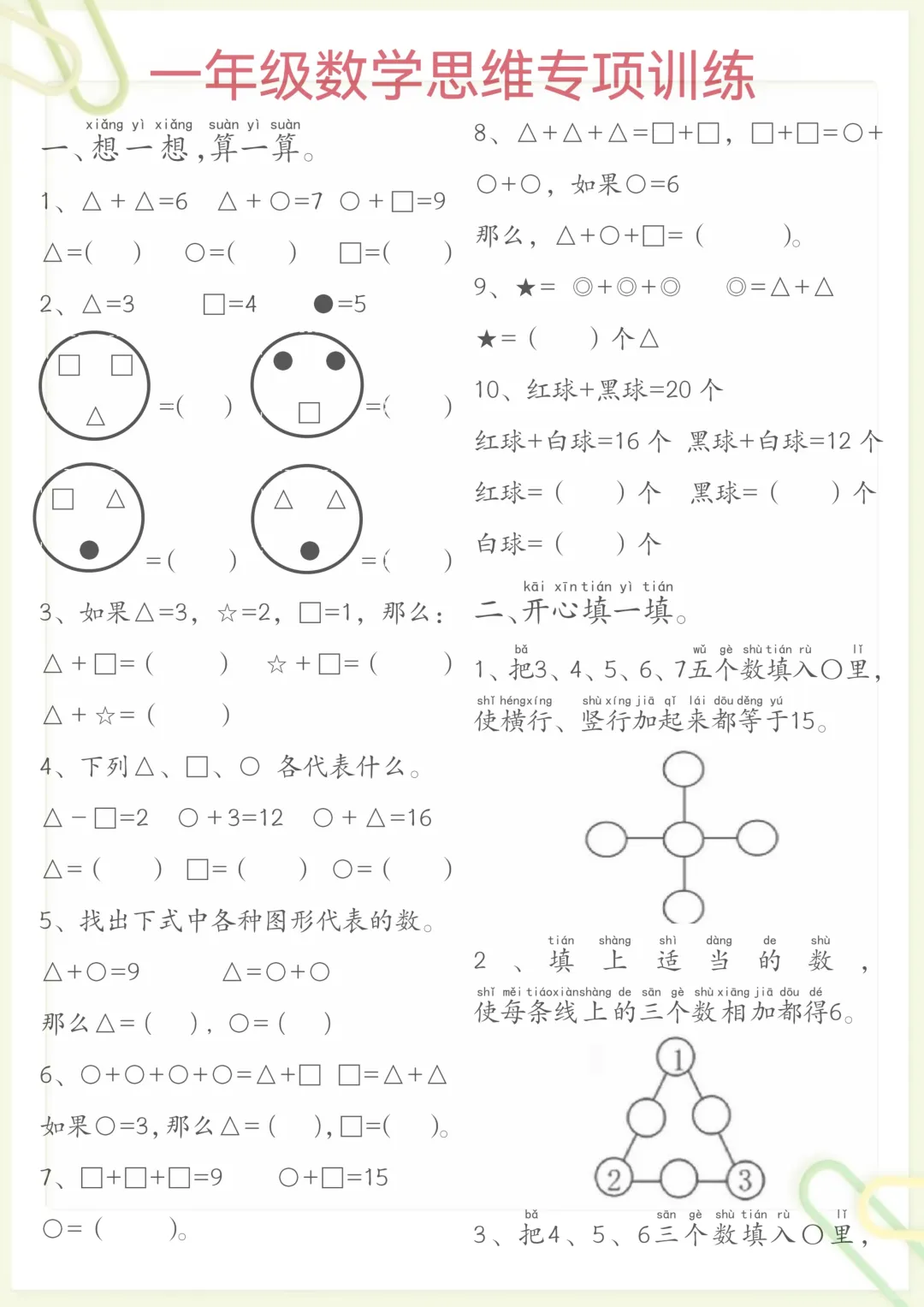 一年级数学思维练习题,电子版可打印