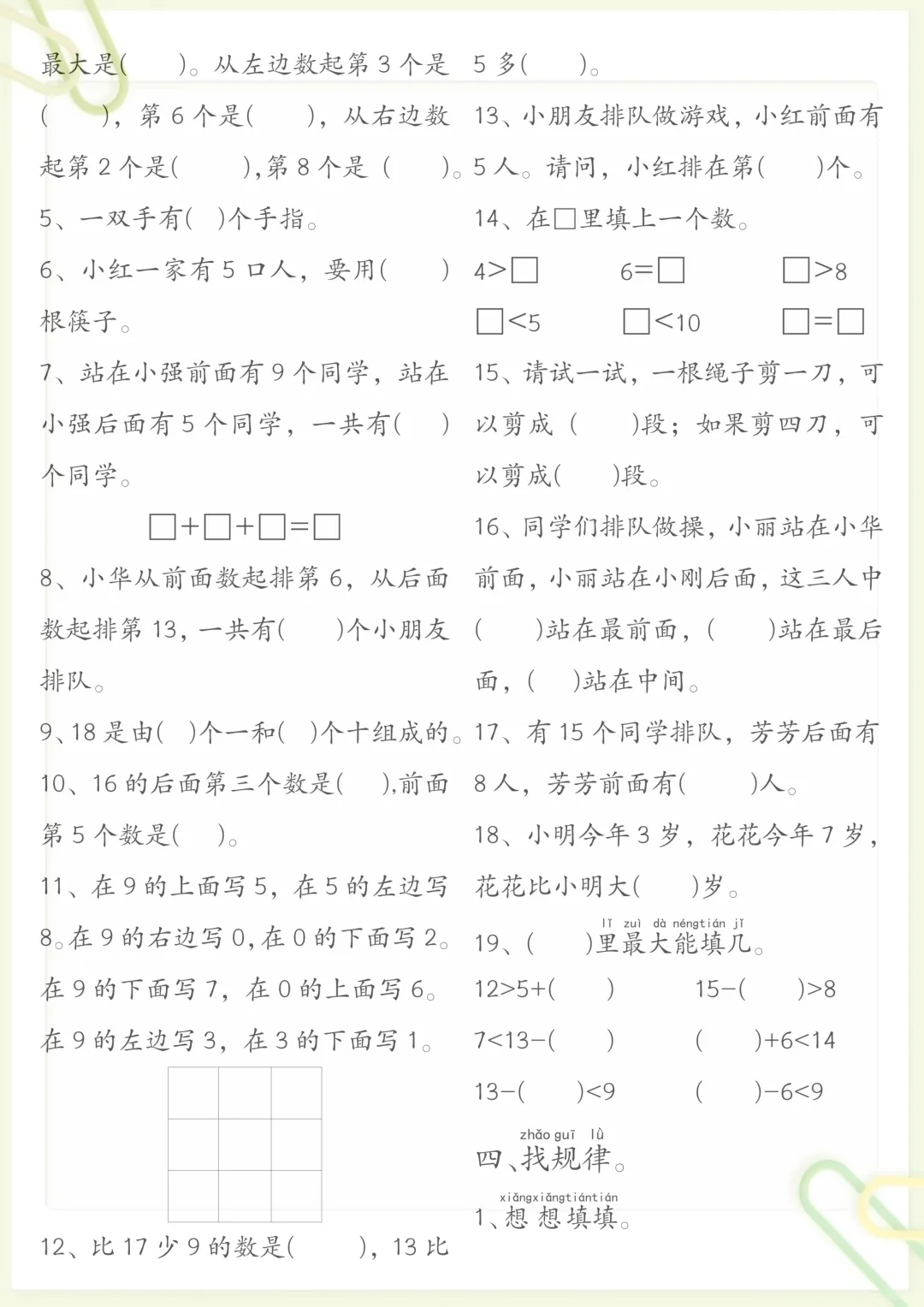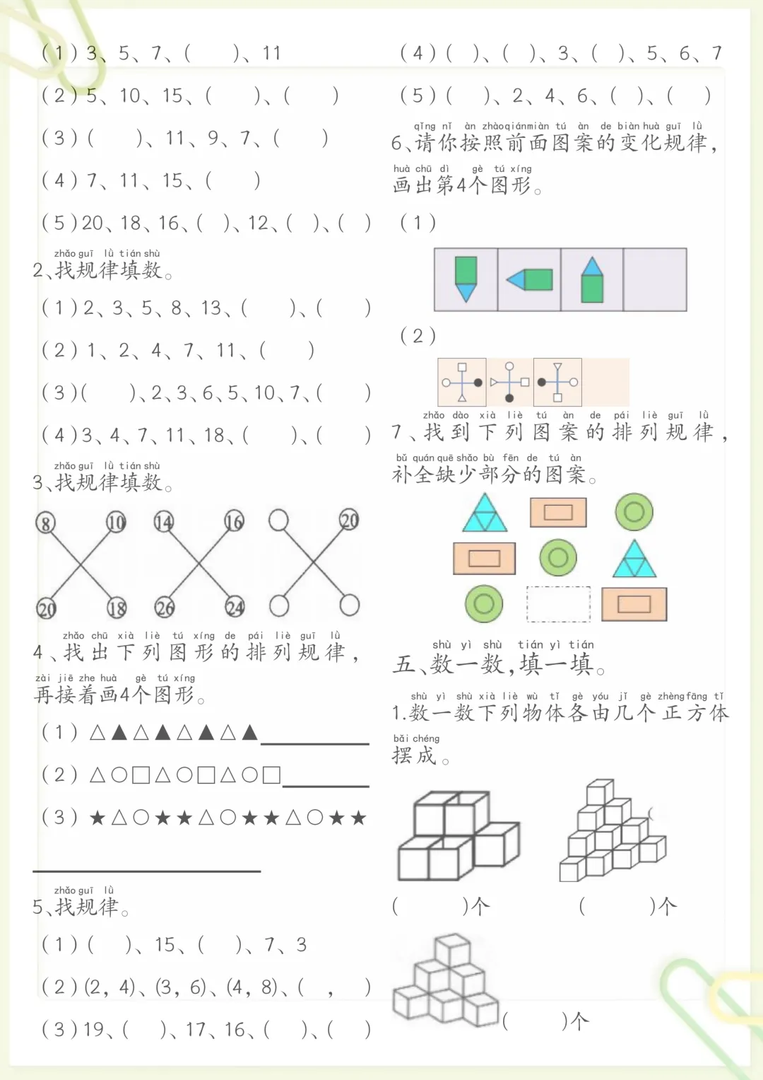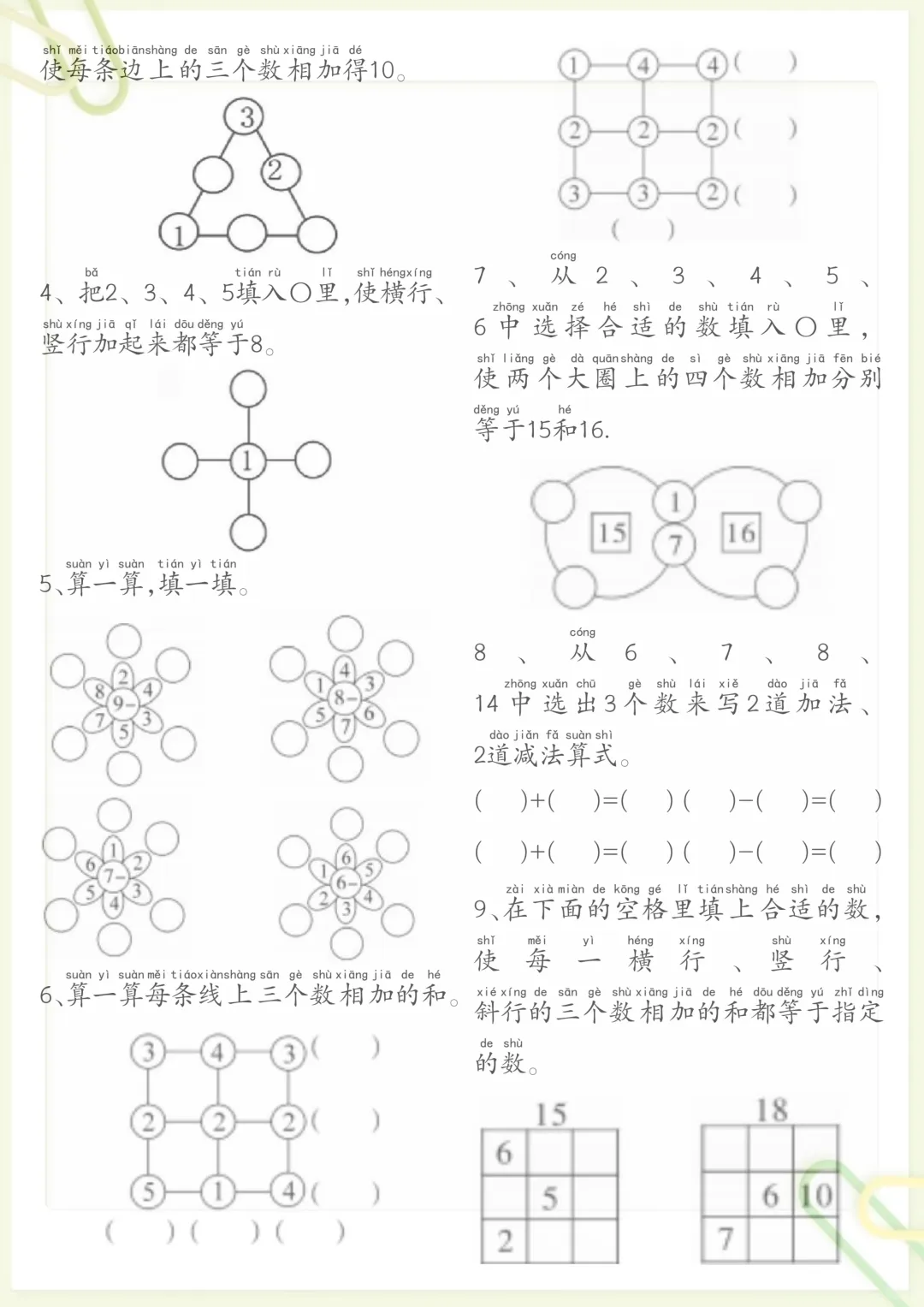 一年级数学思维练习题,共7页,电子版可下载可打印,这份练习题紧扣一年级数学思维训练需求,涵盖多个核心知识点与专项训练内容,帮助孩子在练习中提升观察、分析与解决问题的能力,同时进一步巩固课堂所学,打好基础。需要的家长可以及时下载打印出来,让孩子在家练一练,更有针对性地进行思维启发与能力提升。