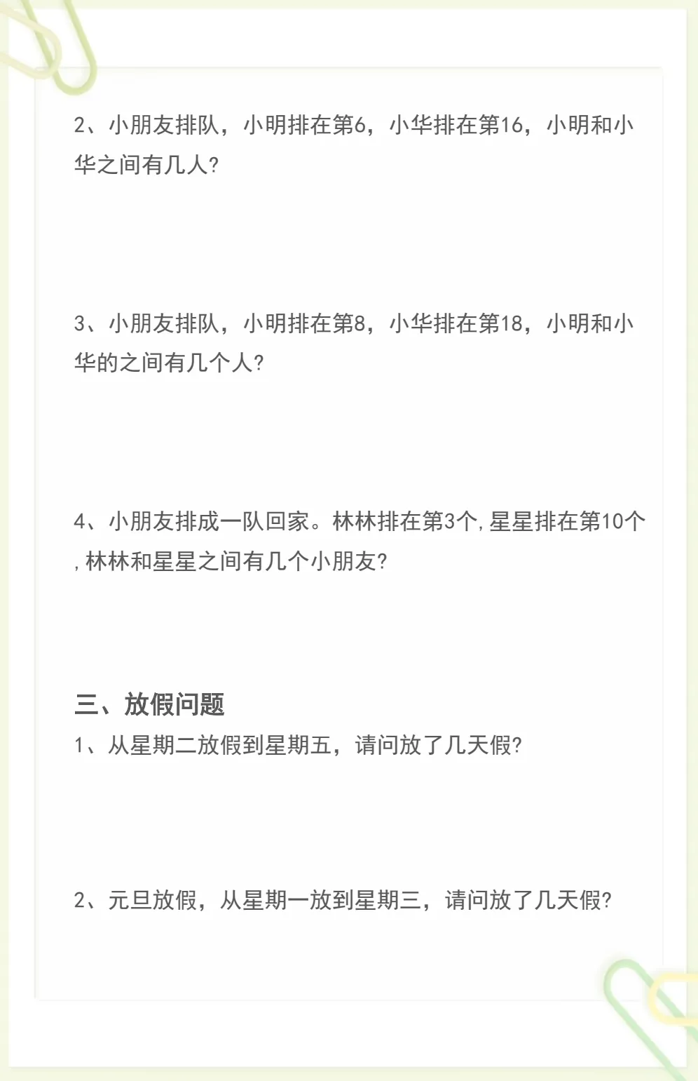 一年级数学排队问题解题方法+典型题型,共6页,电子版可下载可打印,这份资料围绕一年级数学中常见的排队问题进行整理,涵盖排第几、前后位置、人数计算、左右顺序等核心知识点,并结合典型题型帮助孩子掌握解题思路与方法,适合课后巩固和专项练习。需要的家长可以抓紧下载打印出来,让孩子练一练,进一步提升理解与应用能力。