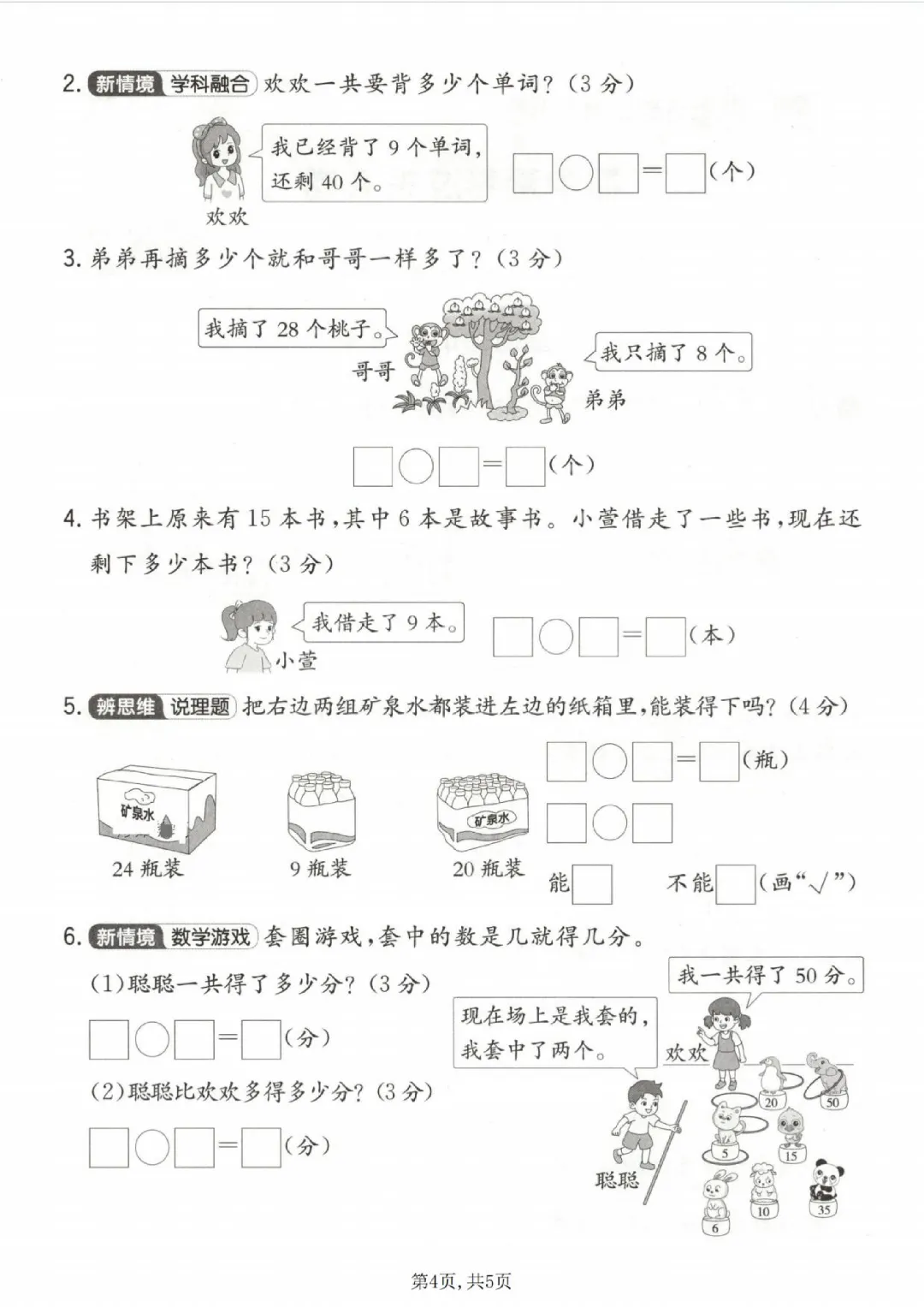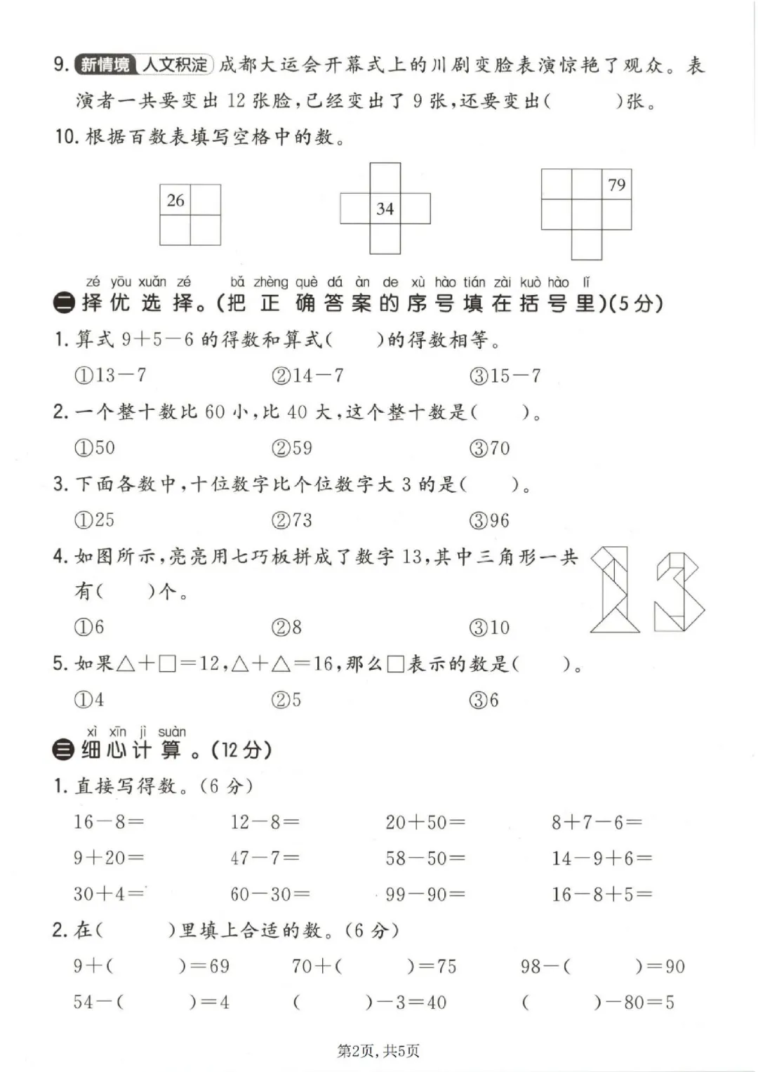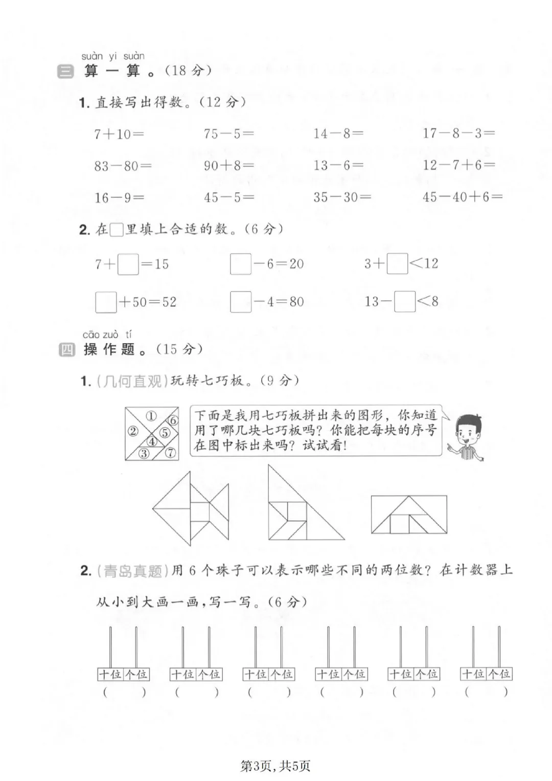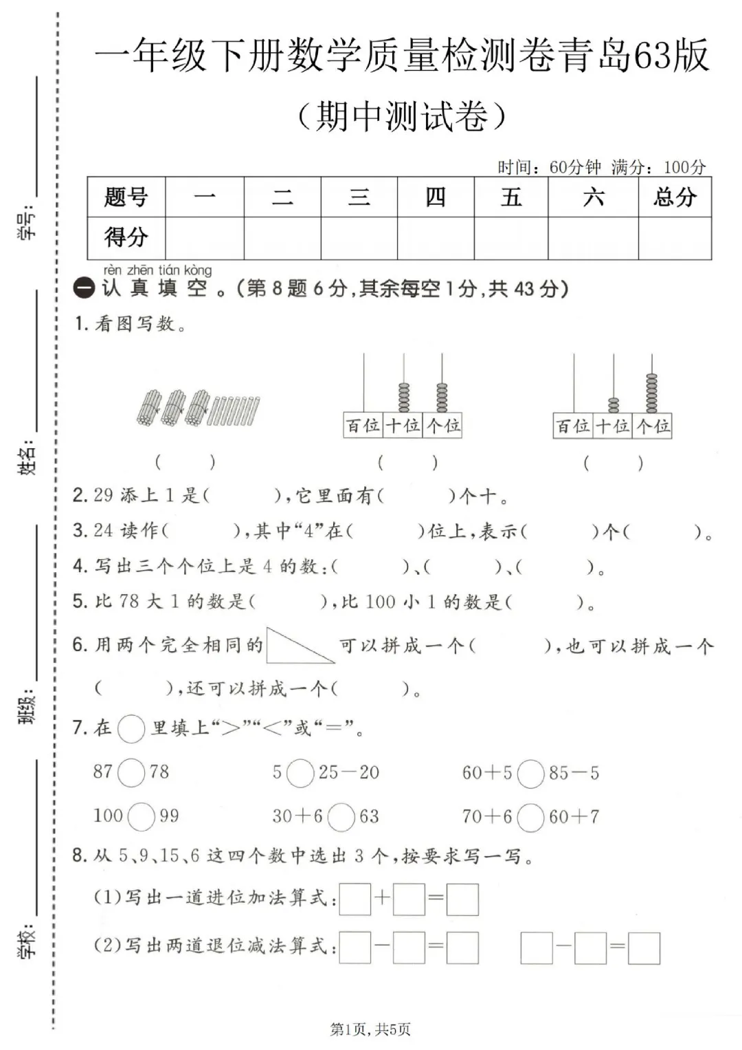 今天给家长们分享的是:26年春新一年级下册青岛63版数学《期中达标测试卷4套》含答案‖高清电子版可打印
