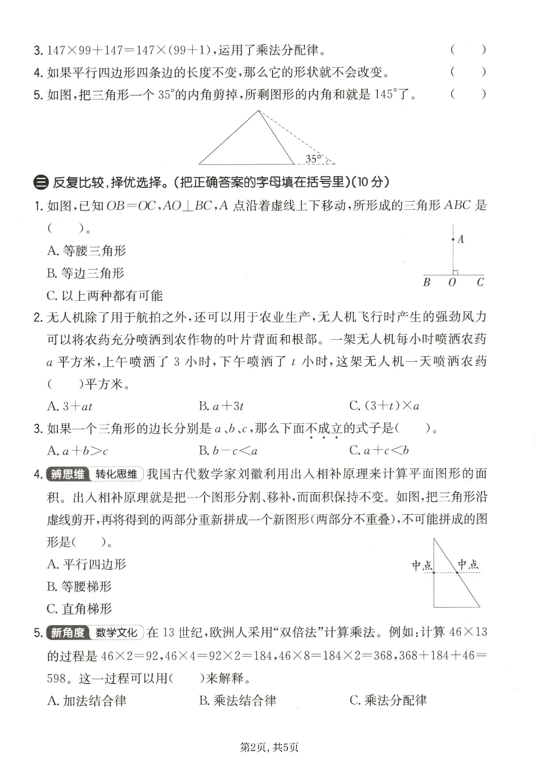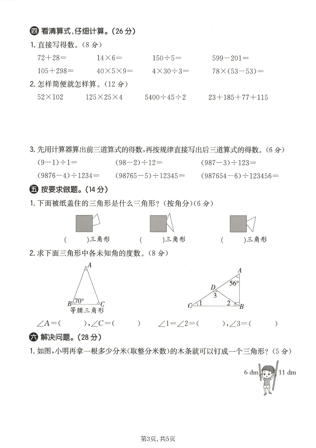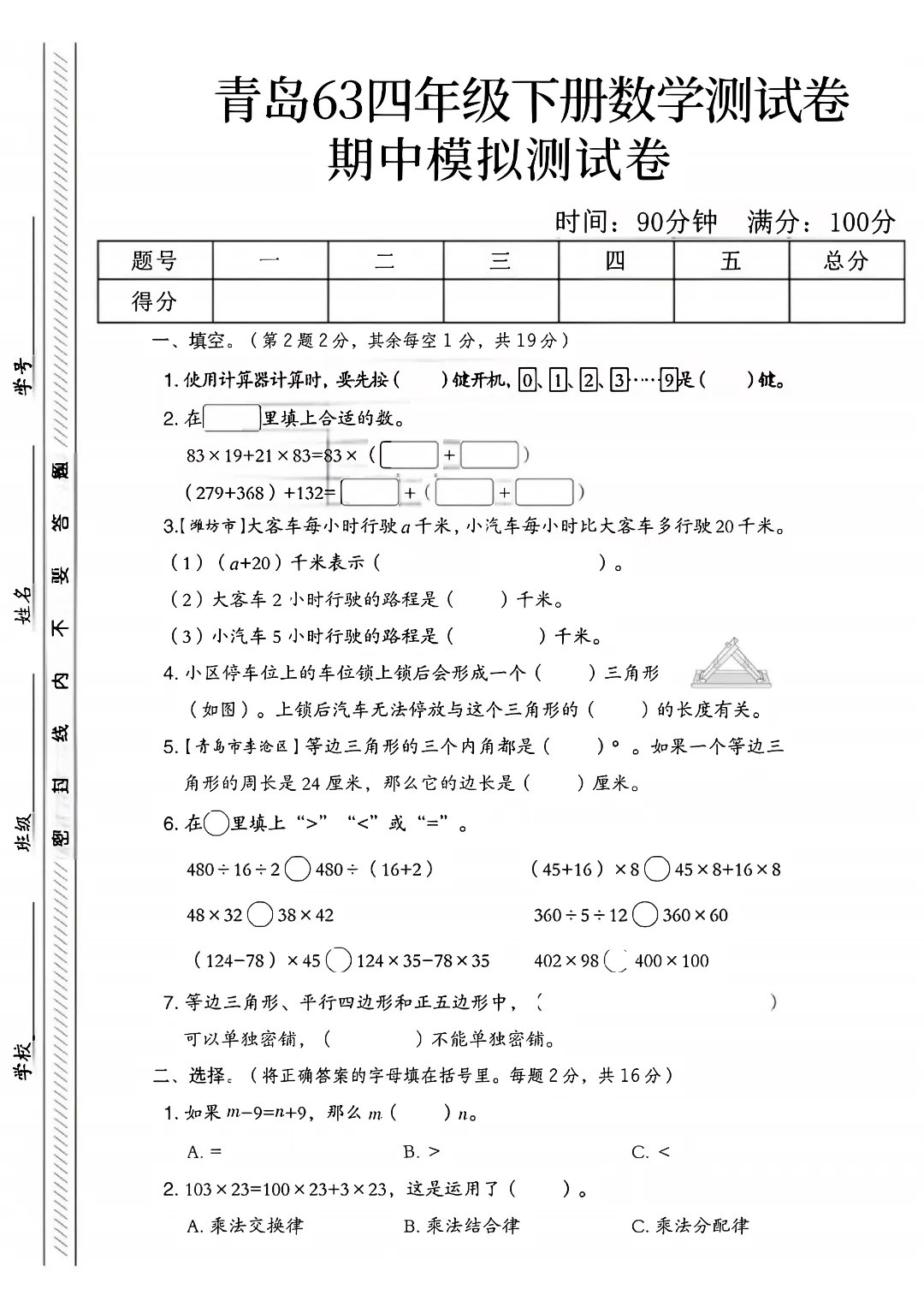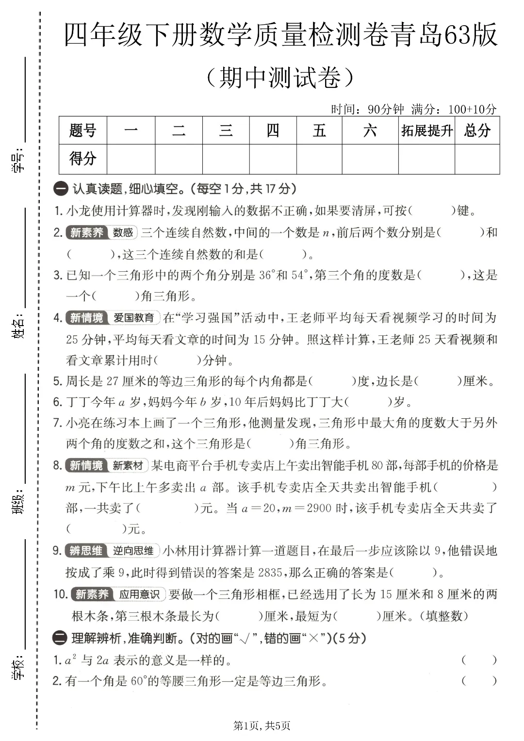 今天给家长们分享的是:26年春新四年级下册青岛63版数学《1-4单元测试卷+期中达标测试卷》共7套含答案‖高清电子版可打印