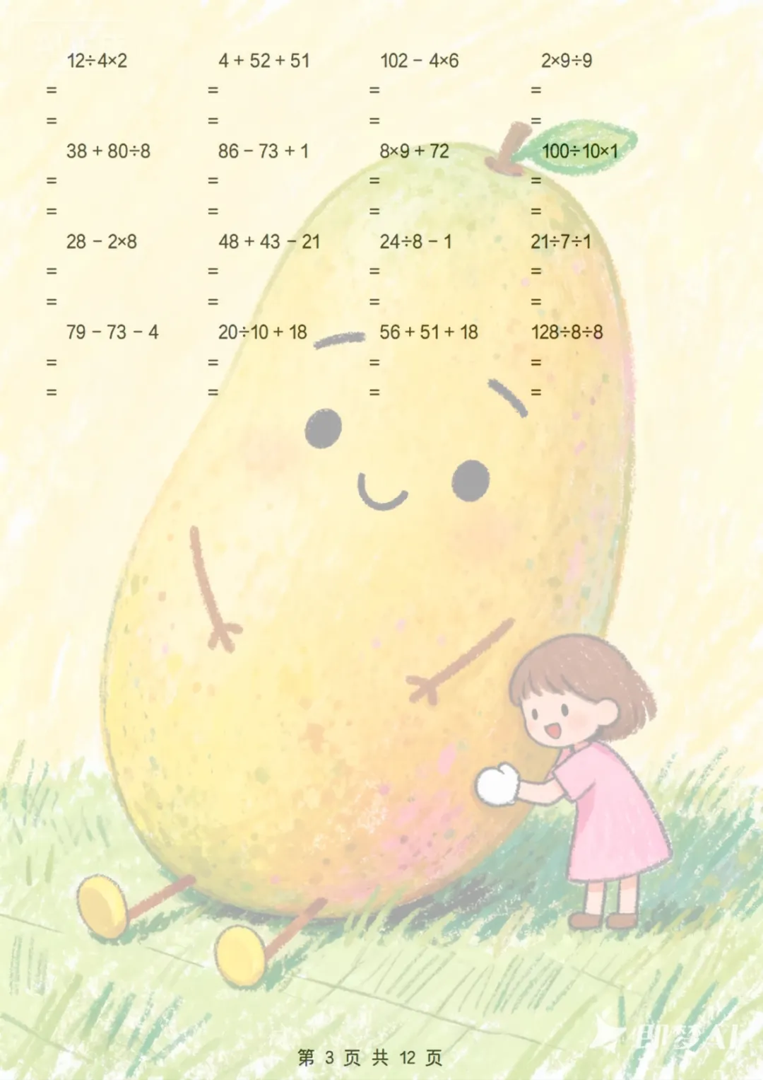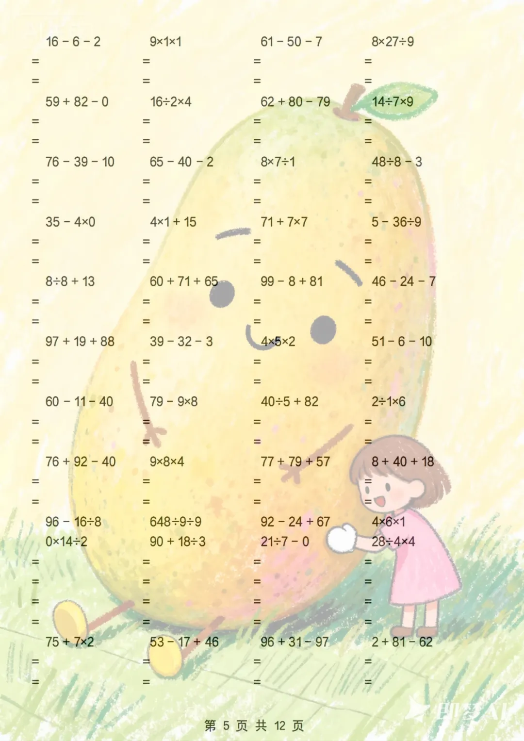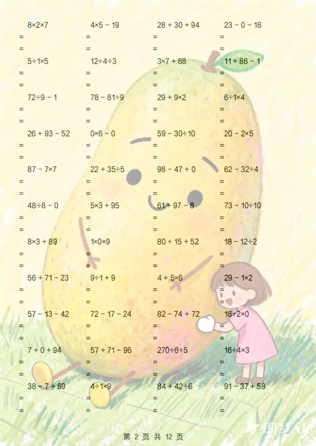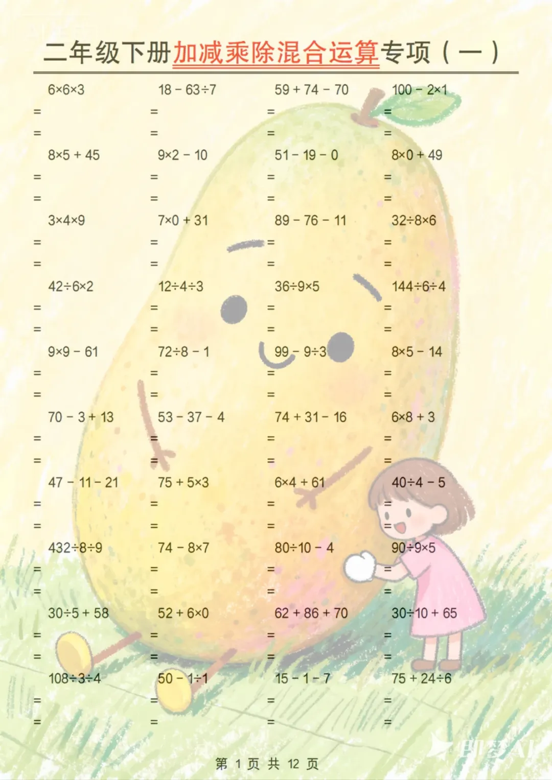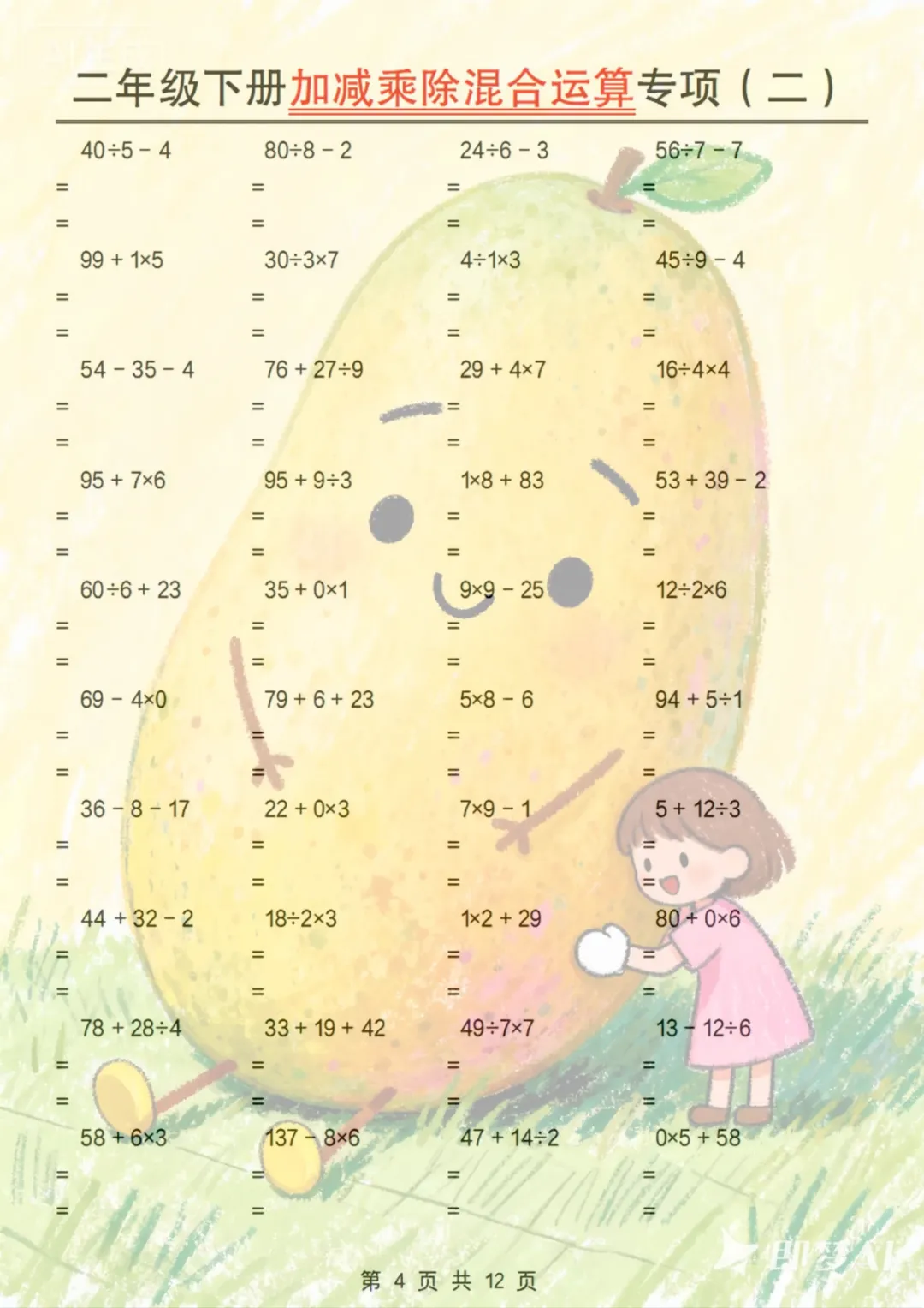 二年级下数学加减乘除混合运算专项,共12页,电子版可下载可打印,这份资料围绕二年级下册数学中的加减乘除混合运算展开练习,涵盖多个核心知识点与专项训练内容,能够帮助孩子进一步理清运算顺序,提升计算准确率和综合解题能力,适合作为日常巩固和阶段性强化使用。需要的家长可以及时保存打印出来,让孩子练一练,更扎实地掌握这部分内容。