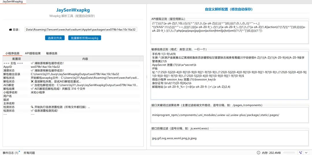 > 找不到?使用 `findsomething` 全局搜索 `packages` 目录。### 2. 清理缓存(关键步骤)该目录下每个文件夹代表一个小程序,可能包含多个 wxapkg 文件。为避免混淆,**建议先清空目录**:1. 关闭微信2. 删除 `packages` 目录下所有文件夹3. 重新打开微信并进入目标小程序### 3. 使用插件解包1. **选择小程序包**:在插件界面选择对应的小程序文件夹2. **自动解包**:插件自动识别主包/分包,多线程并行解密解压3. **提取分析**:自动提取 API 接口和敏感信息,右侧过滤面板排除前端路径### 4. 结果查看- **API 接口**:可复制到 Burp Repeater/Intruder 进一步测试- **敏感信息**:高亮显示手机号、身份证、密钥等泄露数据- **文件浏览**:点击"文件浏览"查看反编译后的源码---## ⚙️ 配置指南### 敏感信息检测规则内置正则规则,支持自定义扩展:| 类型 | 正则示例 ||:---|:---|| 手机号 | `1[3-9]\d{9}` || 身份证号 | `\b\d{17}([0-9]\|X\|x)\b` || 邮箱地址 | `[a-zA-Z0-9._%+-]+@[a-zA-Z0-9.-]+\.[a-zA-Z]{2,4}` || IP 地址 | `^(?:25[0-5]\|...){4}$` || AppSecret 泄露 | `(?i)\b\w*secret\b` || Session Key 泄露 | `(?i)\bsession_key\b` || 车牌号 | `^[京津沪渝...]{1}[A-Z]{1}[A-Z0-9]{4}...$` |### API 提取规则**默认正则**(匹配 URL/URI 路径):```regex(?:"|')(((?:[a-zA-Z]{1,10}://|//)[^"'/]{1,}\.([a-zA-Z]{2,})[^"']{0,})|((?:/|\.\./|\./)[^"'><,;| *()(%%$^/\\\[\]][^"'><,;|()]{1,})|([a-zA-Z0-9_\-/]{1,}/[a-zA-Z0-9_\-/]{1,}\.(?:[a-zA-Z]{1,4}|action)(?:[\?|/][^"|']{0,}|))|([a-zA-Z0-9_\-]{1,}\.(?:php|asp|aspx|jsp|json|action|html|js|txt|xml)(?:\?[^"|']{0,}|)))(?:"|')
