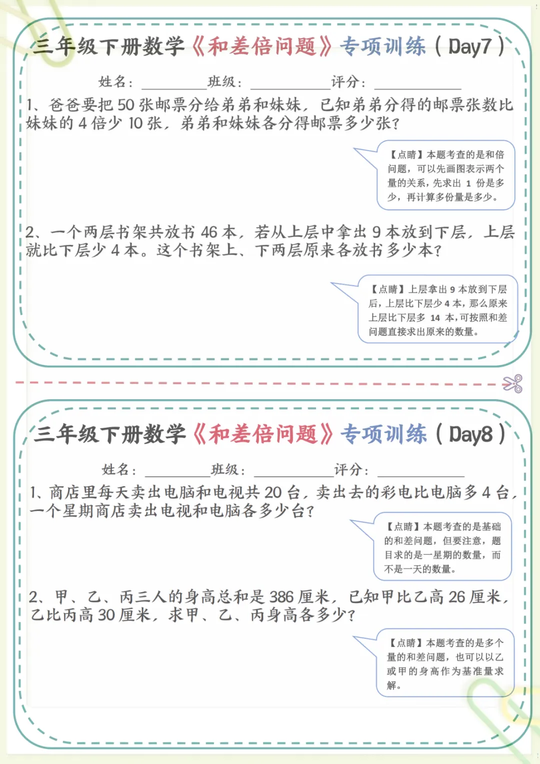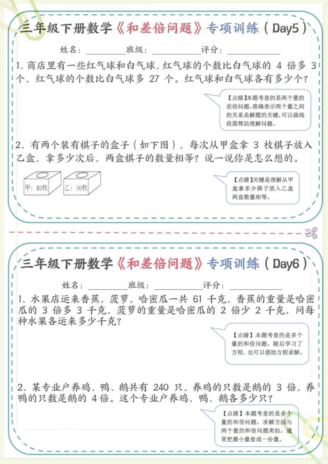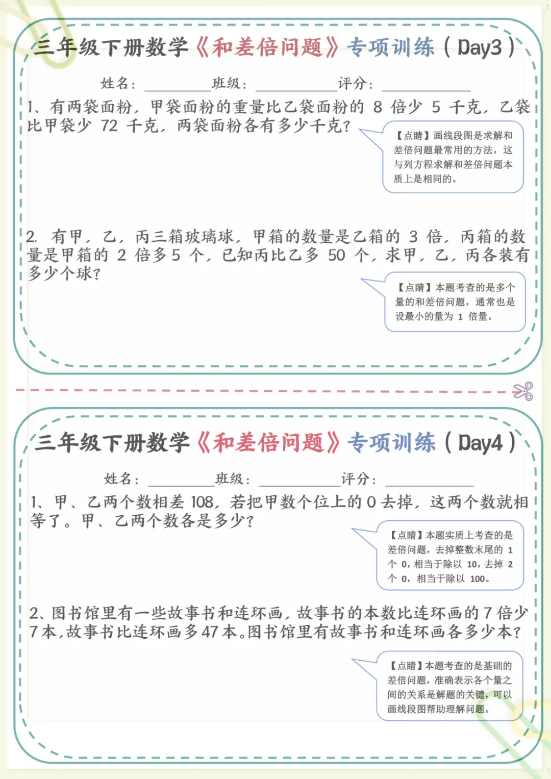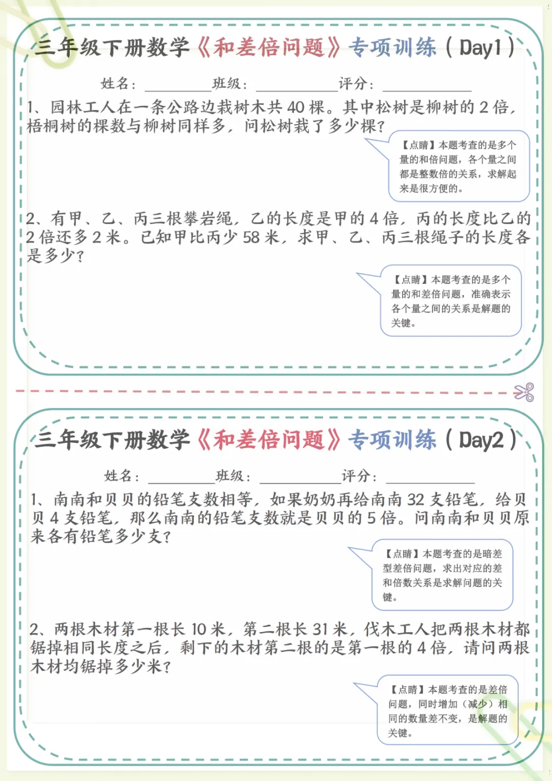 三年级下数学《和差倍问题》专项训练,共17页,电子版可下载可打印,这份资料围绕三年级数学中常见的和差问题、倍数关系等重点内容展开练习,帮助孩子理解数量关系,掌握解题思路,逐步提升分析能力与应用能力,适合课内巩固和课后专项提升。需要的家长可以提前下载打印出来,让孩子有针对性地练一练。