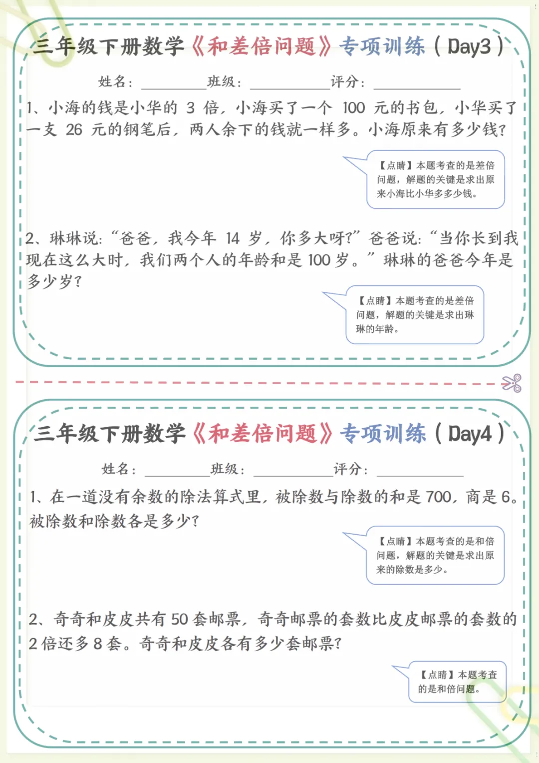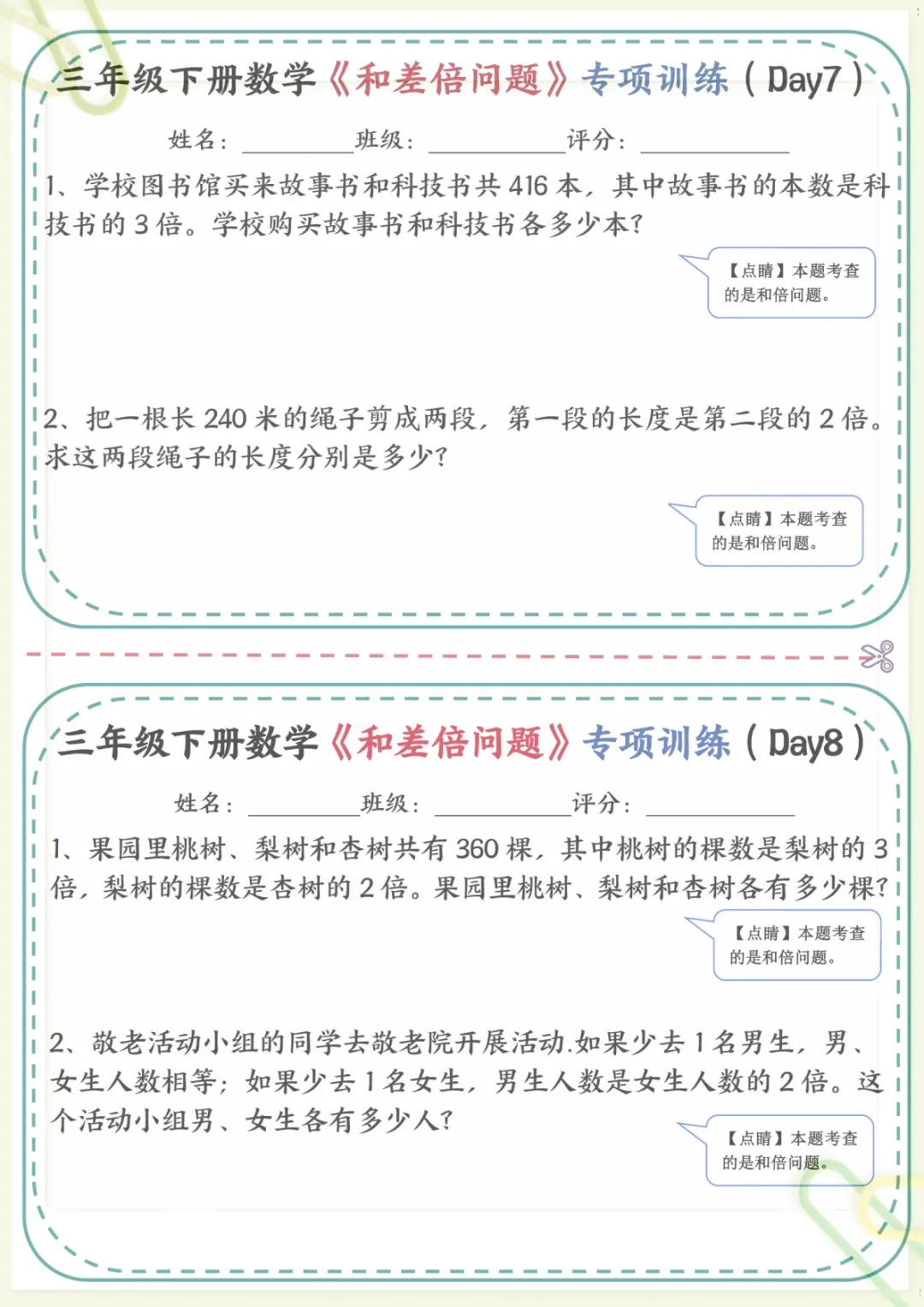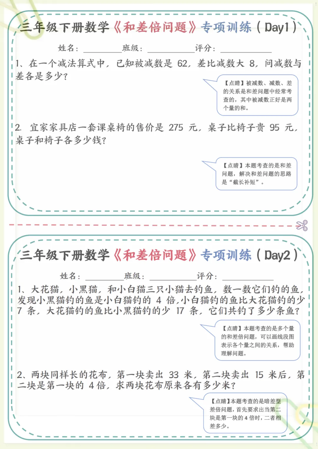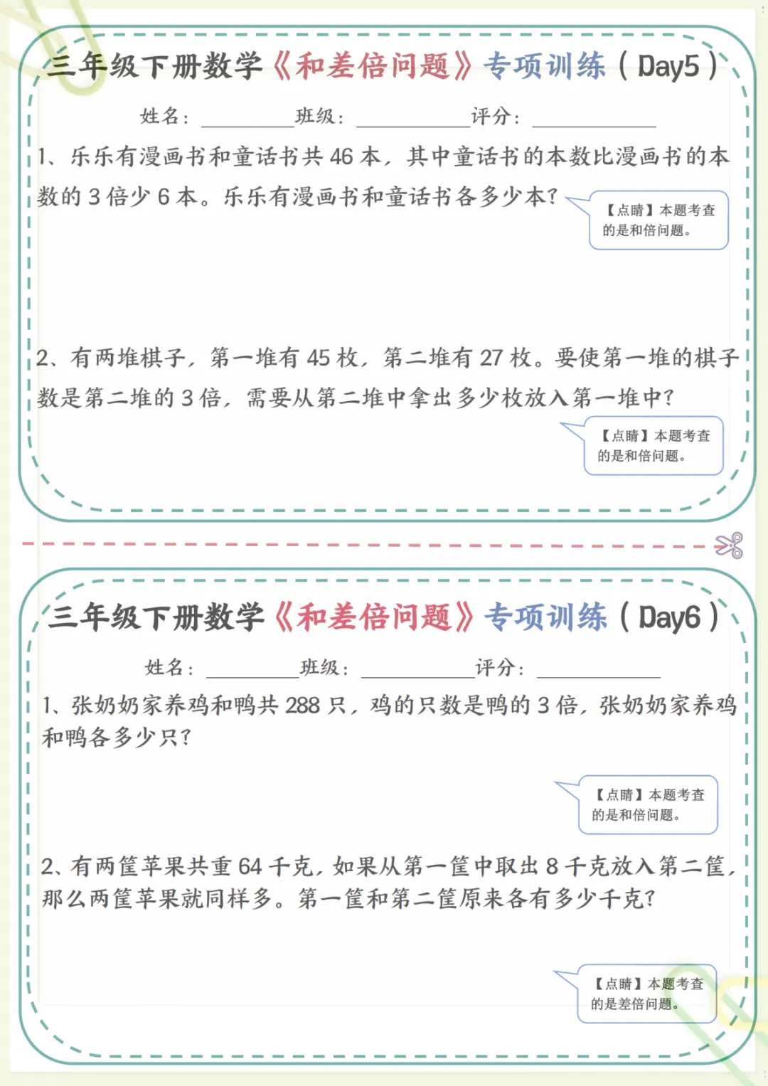 三年级下数学《和差倍问题》专项训练,共17页,电子版可下载可打印,这份资料围绕三年级数学中常见的和差问题、倍数关系等重点内容展开练习,帮助孩子理解数量关系,掌握解题思路,逐步提升分析能力与应用能力,适合课内巩固和课后专项提升。需要的家长可以提前下载打印出来,让孩子有针对性地练一练。