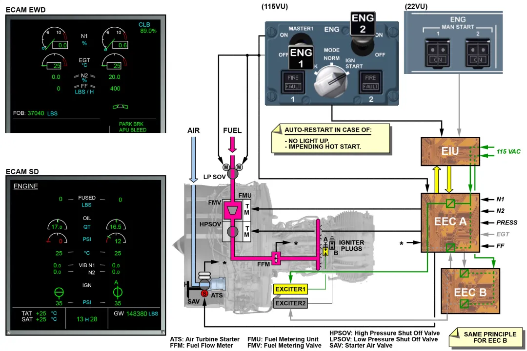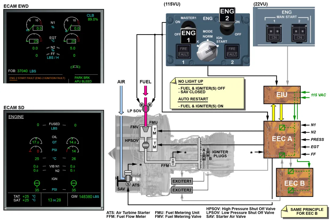 若仍失败,启动中止,EEC 触发 ECAM 警告:ENG X START FAULT – ENG X IGNITION FAULT