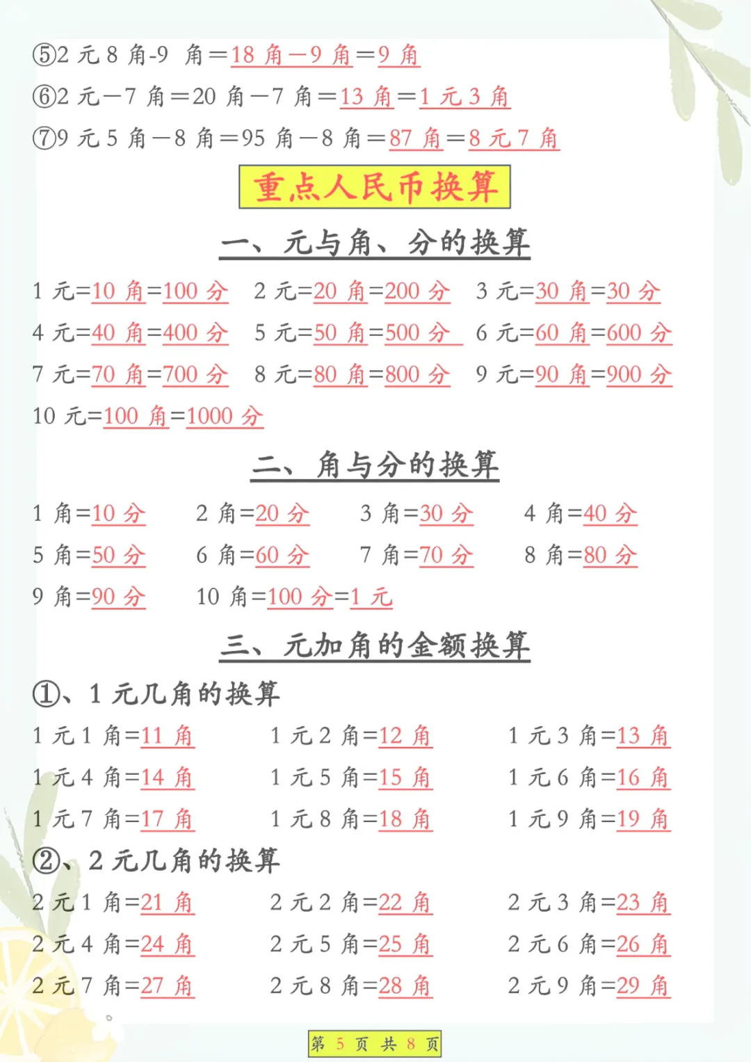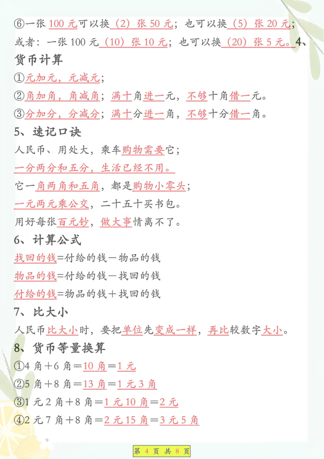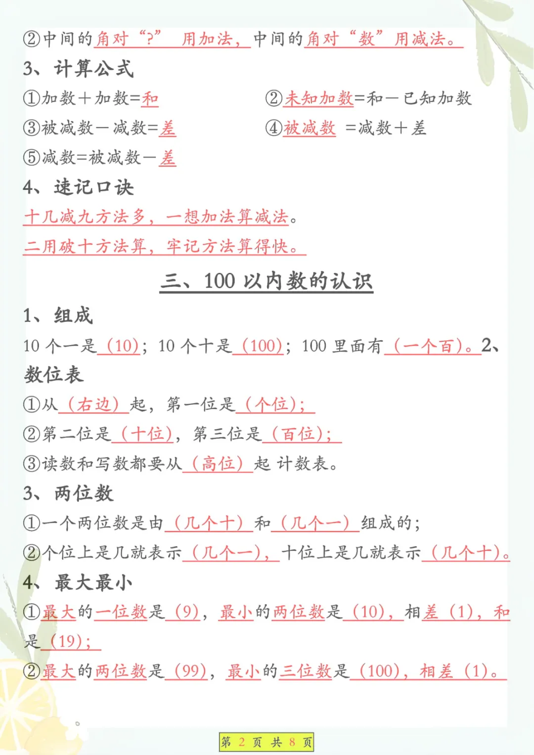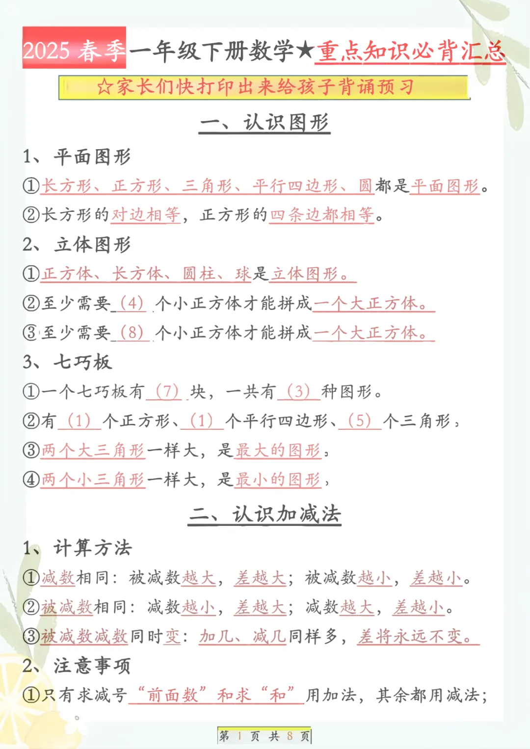 一年级下册数学《必背知识点汇总》,共8页,电子版可下载可打印,这份资料围绕一年级下册数学学习内容整理归纳,涵盖多个核心知识点与专项训练内容,适合孩子课内巩固、课后复习和考前查漏补缺,帮助孩子把基础概念和重点内容记得更牢、学得更扎实。需要的家长可以抓紧保存打印出来,让孩子及时看一看、练一练。