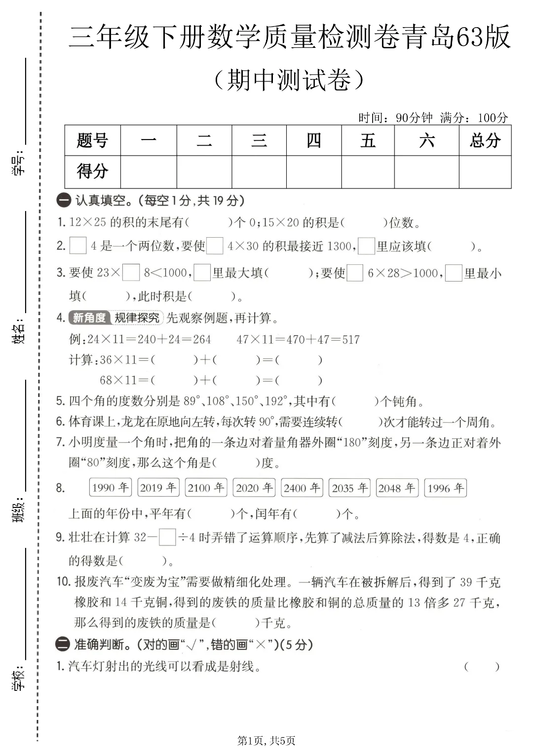 今天给家长们分享的是:26年春新三年级下册青岛63版数学《1-4单元测试卷+期中达标测试卷》共6套含答案‖高清电子版可打印