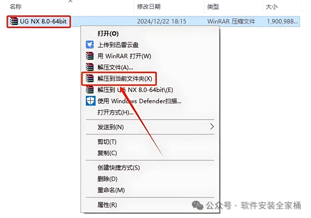 1.打开下载的UG安装包,鼠标右击压缩包,选择【解压到当前文件夹】。