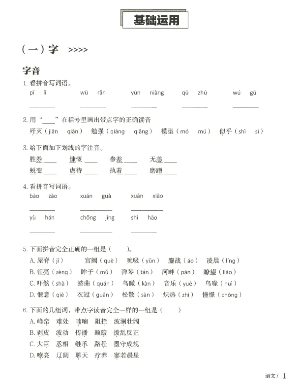 **暑假第一周到第二周:字音字形+成语运用。** 每天做两页,大概15-20分钟。这两块是最好提分的,因为就是纯记忆的东西。你记住了一个字的正确读音,考试的时候就不会选错。没有什么理解难度,就是会不会的问题。