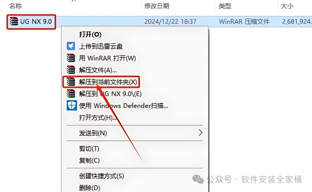 1.打开下载的UG NX9.0安装包,鼠标右击压缩包,选择【解压到当前文件夹】。