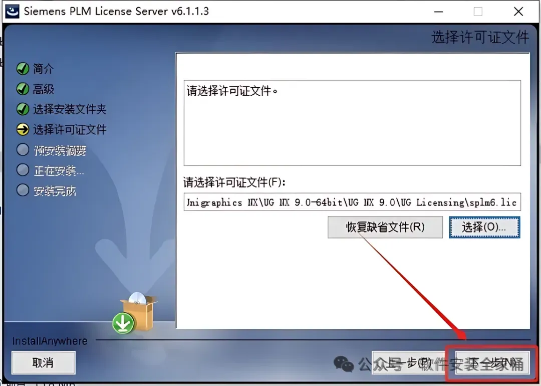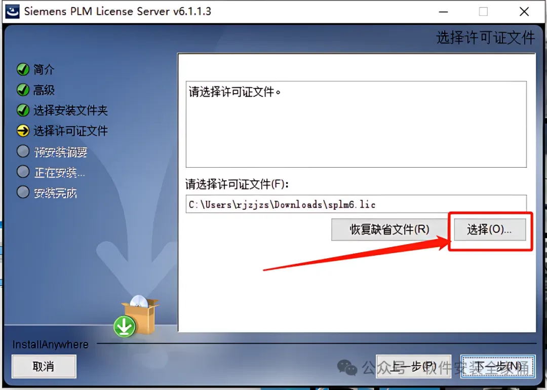 24.点击【选择】选择之前更改的splm6许可证文件。
